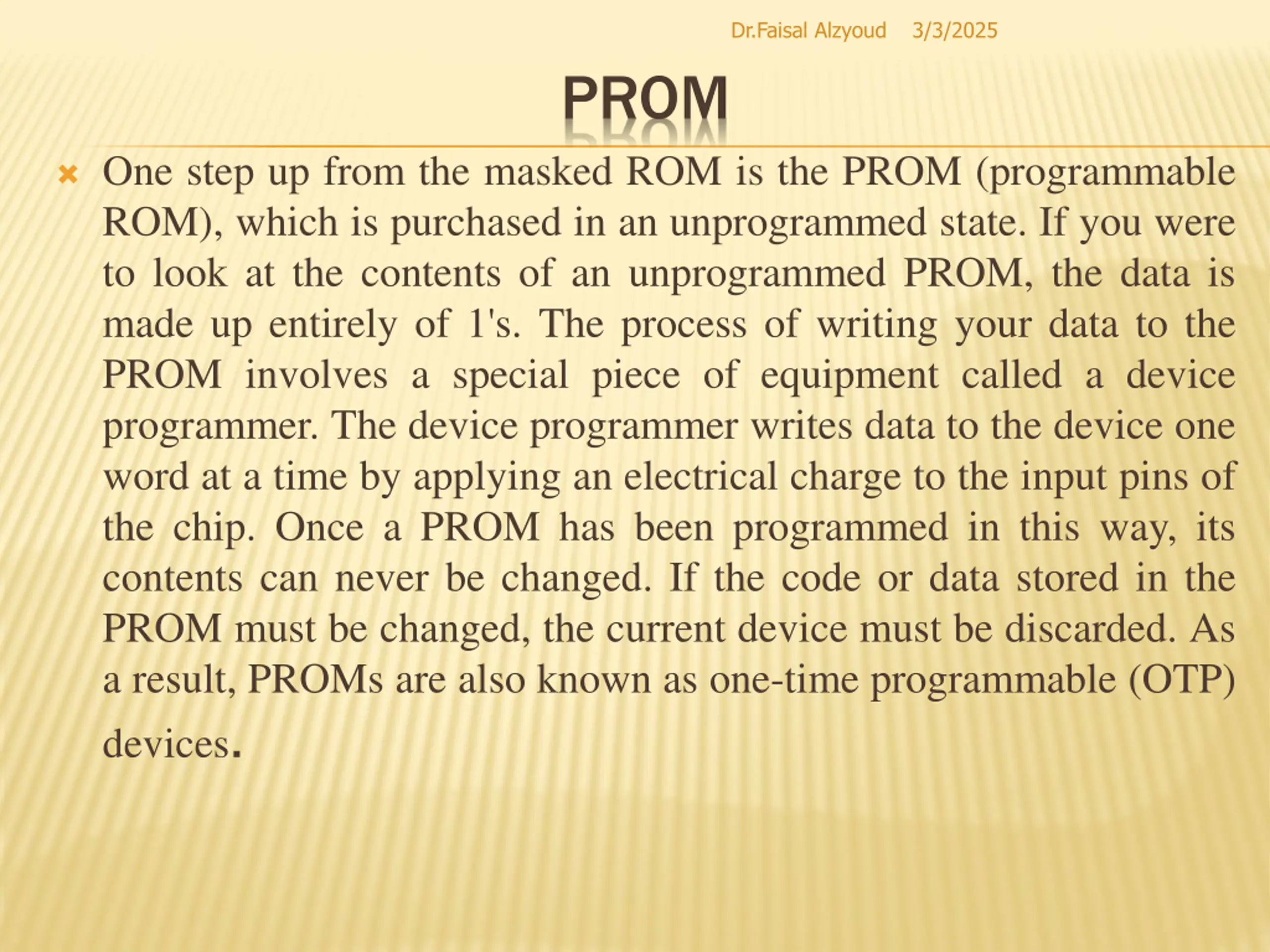 Dr.Faisal Alzyoud 3/3/2025 PROM One step up from the masked ROM is the PROM (programmable ROM), which is purchased in an unprogrammed state. If you were to look at the contents of an unprogrammed PROM, the data is made up entirely of 1's. The process of writing your data to the PROM involves a special piece of equipment called a device programmer. The device programmer writes data to the device one word at a time by applying an electrical charge to the input pins of the chip. Once a PROM has been programmed in this way, its contents can never be changed. If the code or data stored in the PROM must be changed, the current device must be discarded. As a result, PROMs are also known as one-time programmable (OTP) devices.