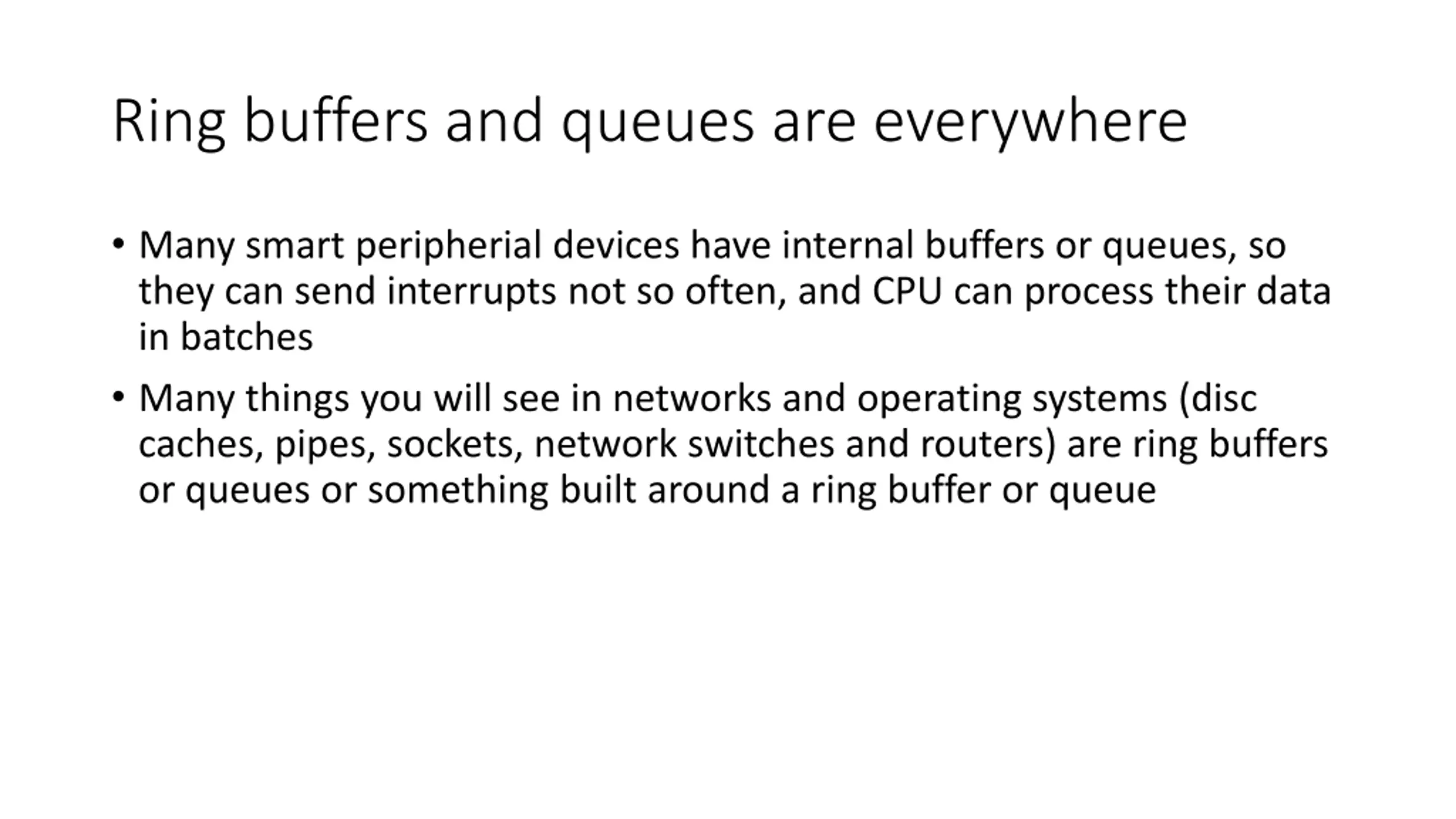 Ring buffers and queues are everywhere Many smart peripherial devices have internal buffers or queues, so they can send interrupts not so often, and CPU can process their data in batches Many things you will see in networks and operating systems (disc caches, pipes, sockets, network switches and routers) are ring buffers or queues or something built around a ring buffer or queue