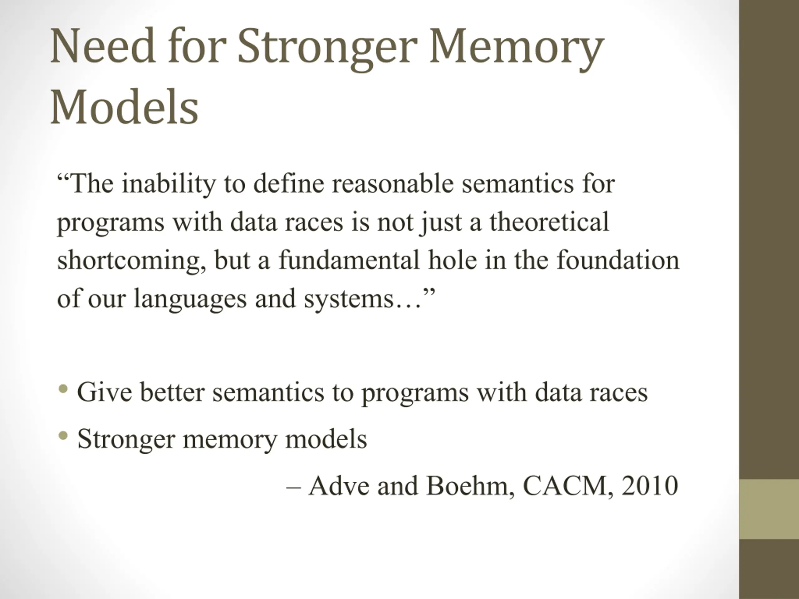 Need for Stronger Memory Models The inability to define reasonable semantics for programs with data races is not just a theoretical shortcoming, but a fundamental hole in the foundation of our languages and systems Give better semantics to programs with data races Stronger memory models Adve and Boehm, CACM, 2010