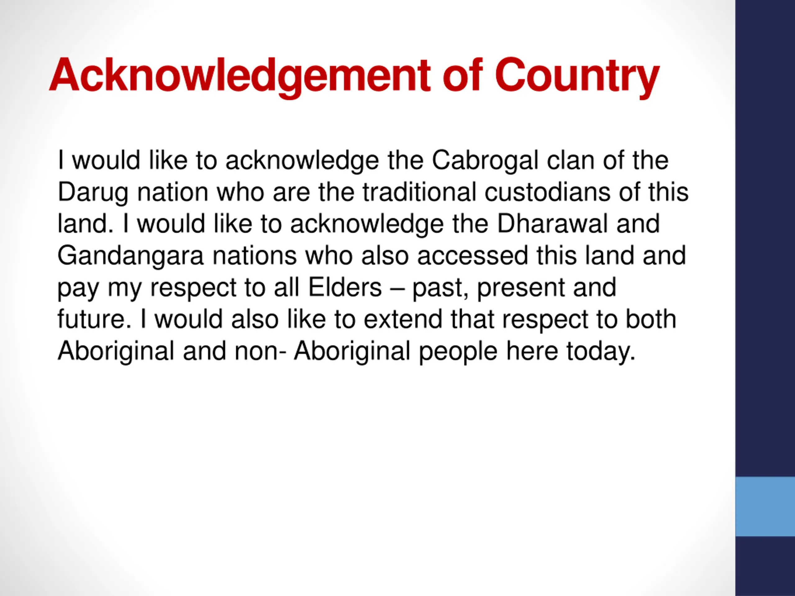 Acknowledgement of Country I would like to acknowledge the Cabrogal clan of the Darug nation who are the traditional custodians of this land. I would like to acknowledge the Dharawal and Gandangara nations who also accessed this land and pay my respect to all Elders past, present and future. I would also like to extend that respect to both Aboriginal and non- Aboriginal people here today.