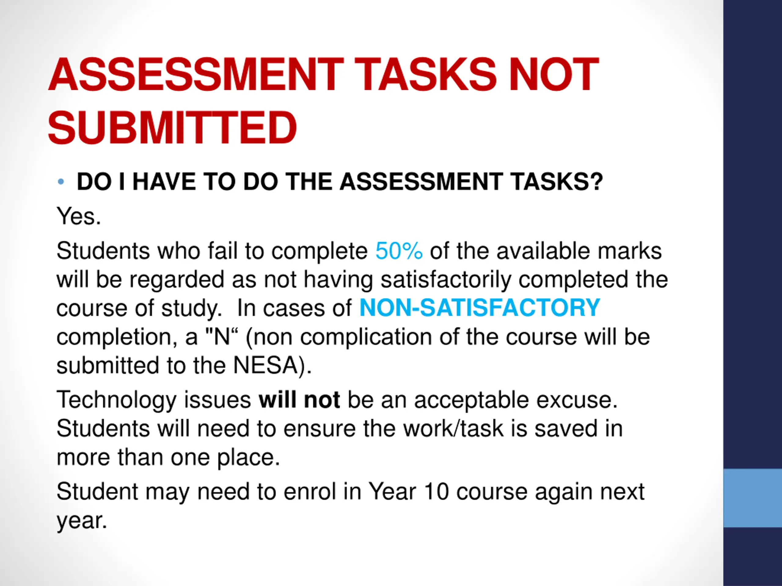 ASSESSMENT TASKS NOT SUBMITTED DO I HAVE TO DO THE ASSESSMENT TASKS? Yes. Students who fail to complete 50% of the available marks will be regarded as not having satisfactorily completed the course of study. In cases of NON-SATISFACTORY completion, a "N (non complication of the course will be submitted to the NESA). Technology issues will not be an acceptable excuse. Students will need to ensure the work/task is saved in more than one place. Student may need to enrol in Year 10 course again next year.