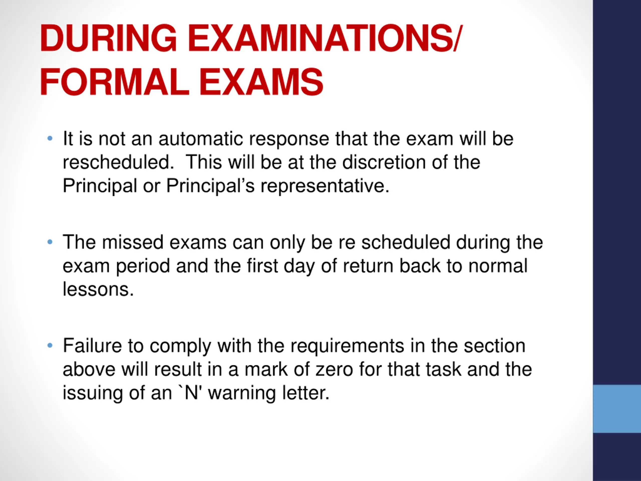 DURING EXAMINATIONS/ FORMAL EXAMS It is not an automatic response that the exam will be rescheduled. This will be at the discretion of the Principal or Principal s representative. The missed exams can only be re scheduled during the exam period and the first day of return back to normal lessons. Failure to comply with the requirements in the section above will result in a mark of zero for that task and the issuing of an `N' warning letter.