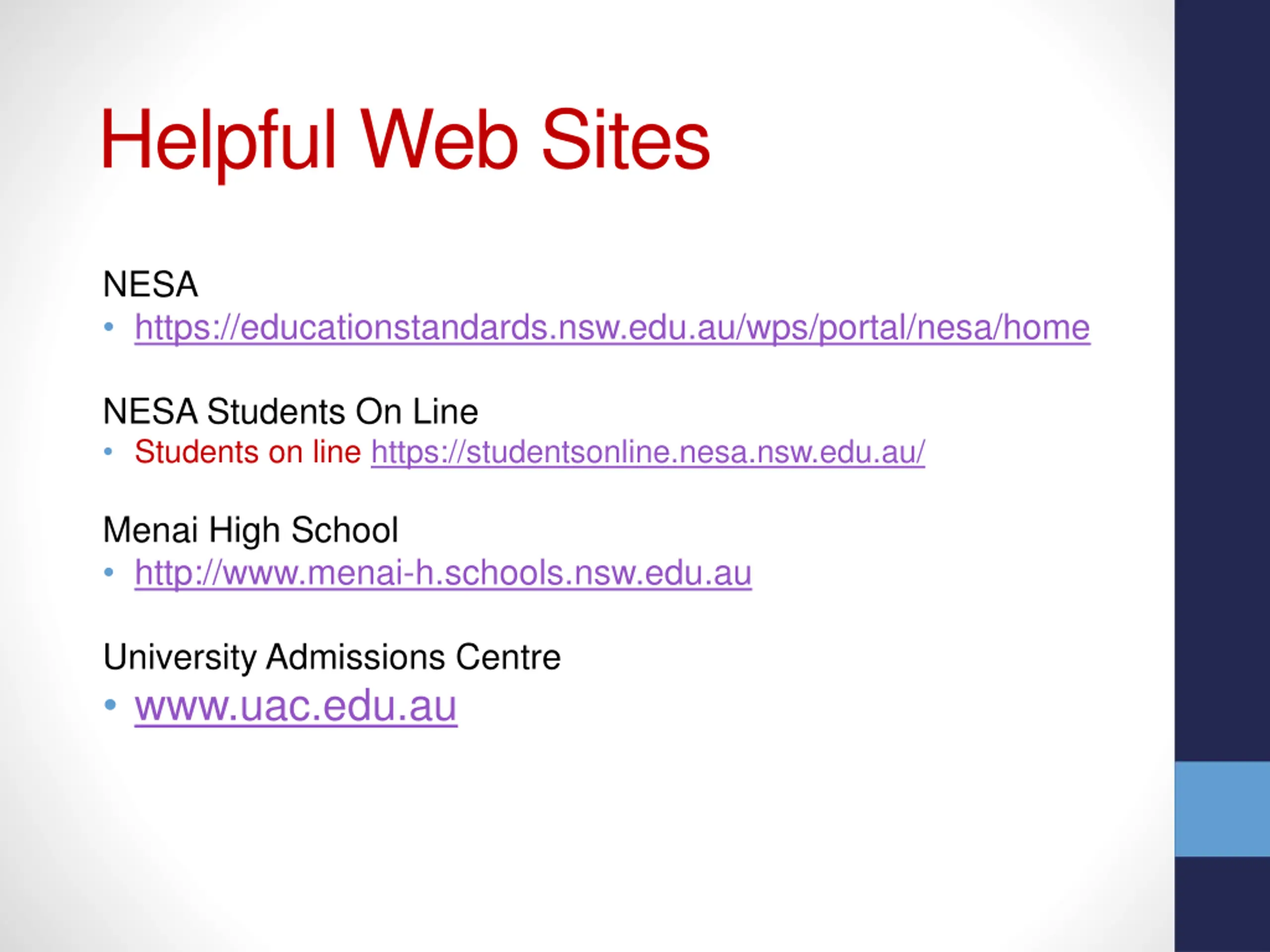 Helpful Web Sites NESA https://educationstandards.nsw.edu.au/wps/portal/nesa/home NESA Students On Line Students on line https://studentsonline.nesa.nsw.edu.au/ Menai High School http://www.menai-h.schools.nsw.edu.au University Admissions Centre www.uac.edu.au
