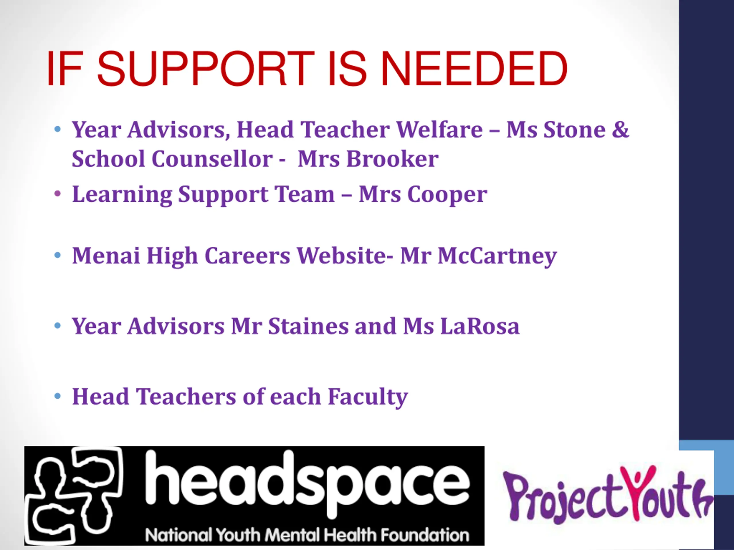 IF SUPPORT IS NEEDED Year Advisors, Head Teacher Welfare Ms Stone & School Counsellor - Mrs Brooker Learning Support Team Mrs Cooper Menai High Careers Website- Mr McCartney Year Advisors Mr Staines and Ms LaRosa Head Teachers of each Faculty