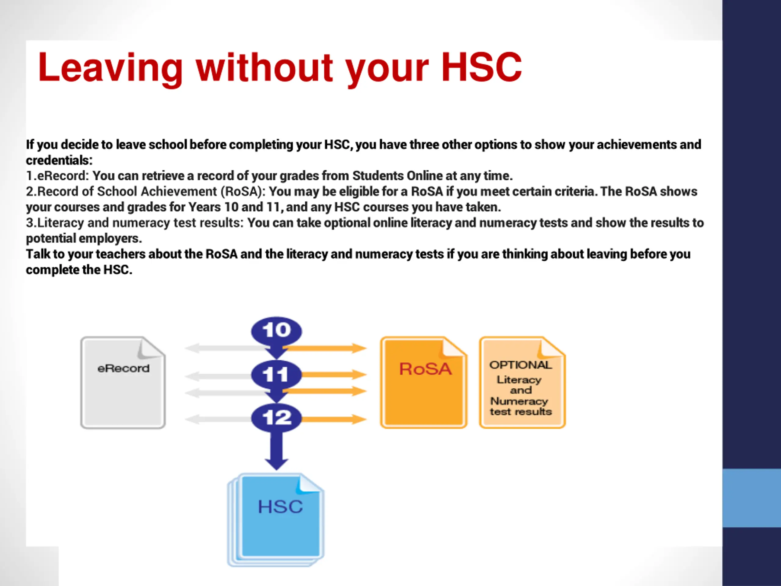 Leaving without your HSC If you decide to leave school before completing your HSC, you have three other options to show your achievements and credentials: 1.eRecord: You can retrieve a record of your grades from Students Online at any time. 2.Record of School Achievement (RoSA): You may be eligible for a RoSA if you meet certain criteria. The RoSA shows your courses and grades for Years 10 and 11, and any HSC courses you have taken. 3.Literacy and numeracy test results: You can take optional online literacy and numeracy tests and show the results to potential employers. Talk to your teachers about the RoSA and the literacy and numeracy tests if you are thinking about leaving before you complete the HSC.