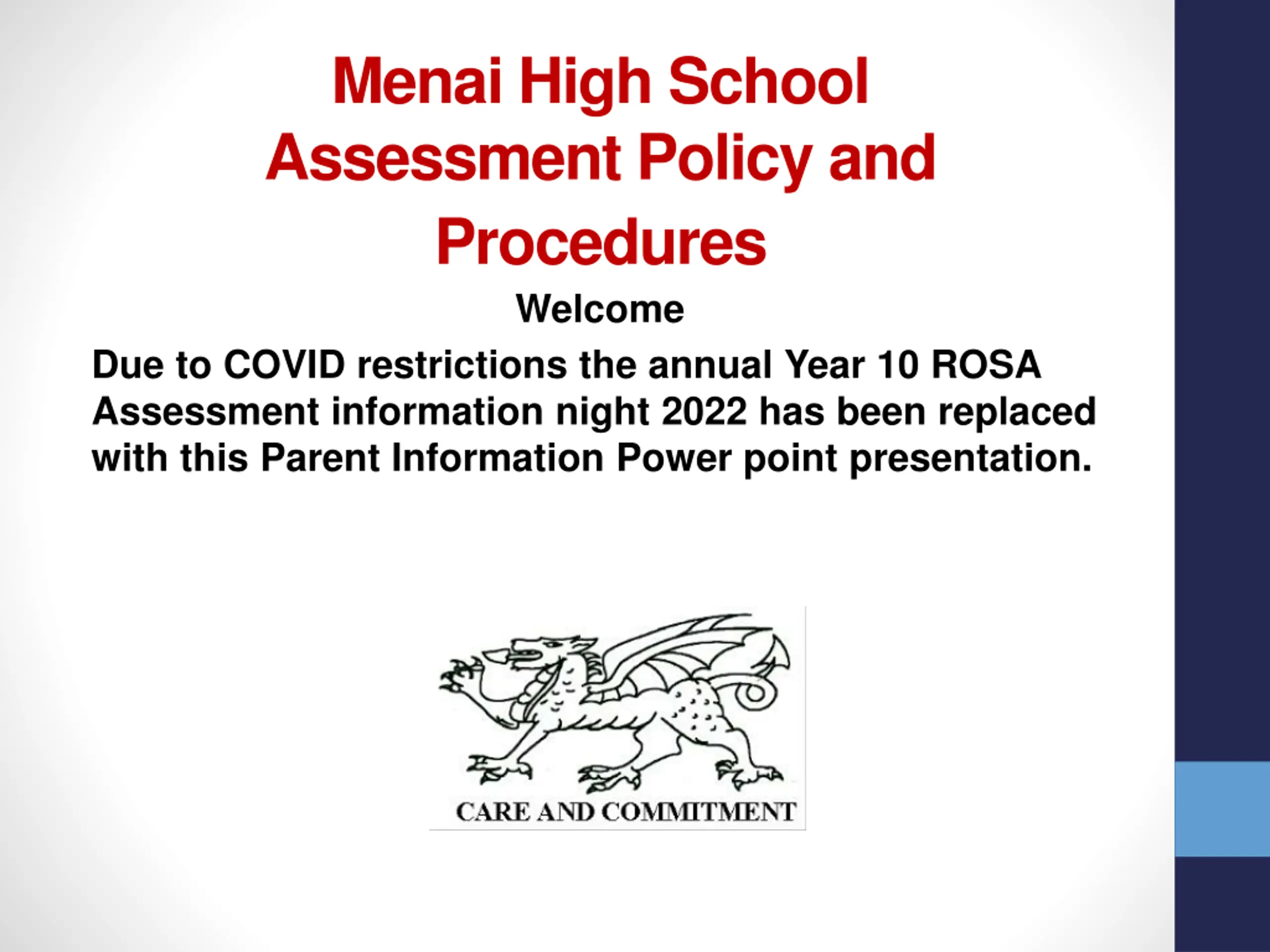 Menai High School Assessment Policy and Procedures Welcome Due to COVID restrictions the annual Year 10 ROSA Assessment information night 2022 has been replaced with this Parent Information Power point presentation.