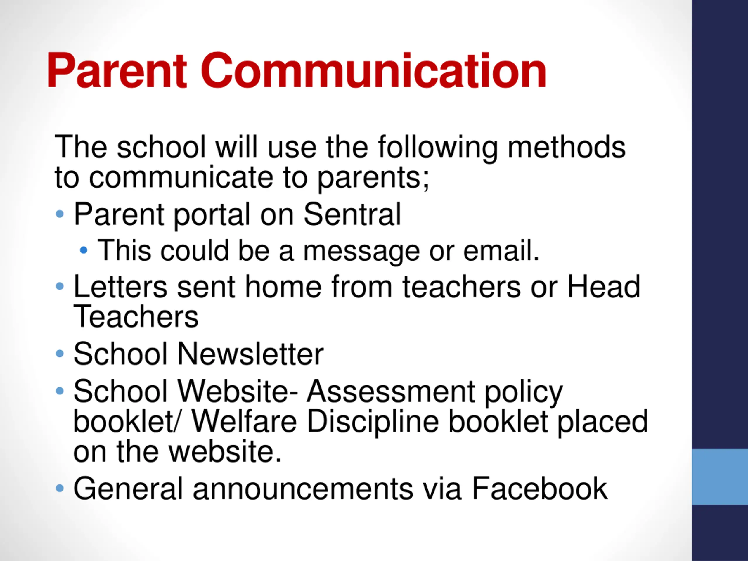 Parent Communication The school will use the following methods to communicate to parents; Parent portal on Sentral This could be a message or email. Letters sent home from teachers or Head Teachers School Newsletter School Website- Assessment policy booklet/ Welfare Discipline booklet placed on the website. General announcements via Facebook