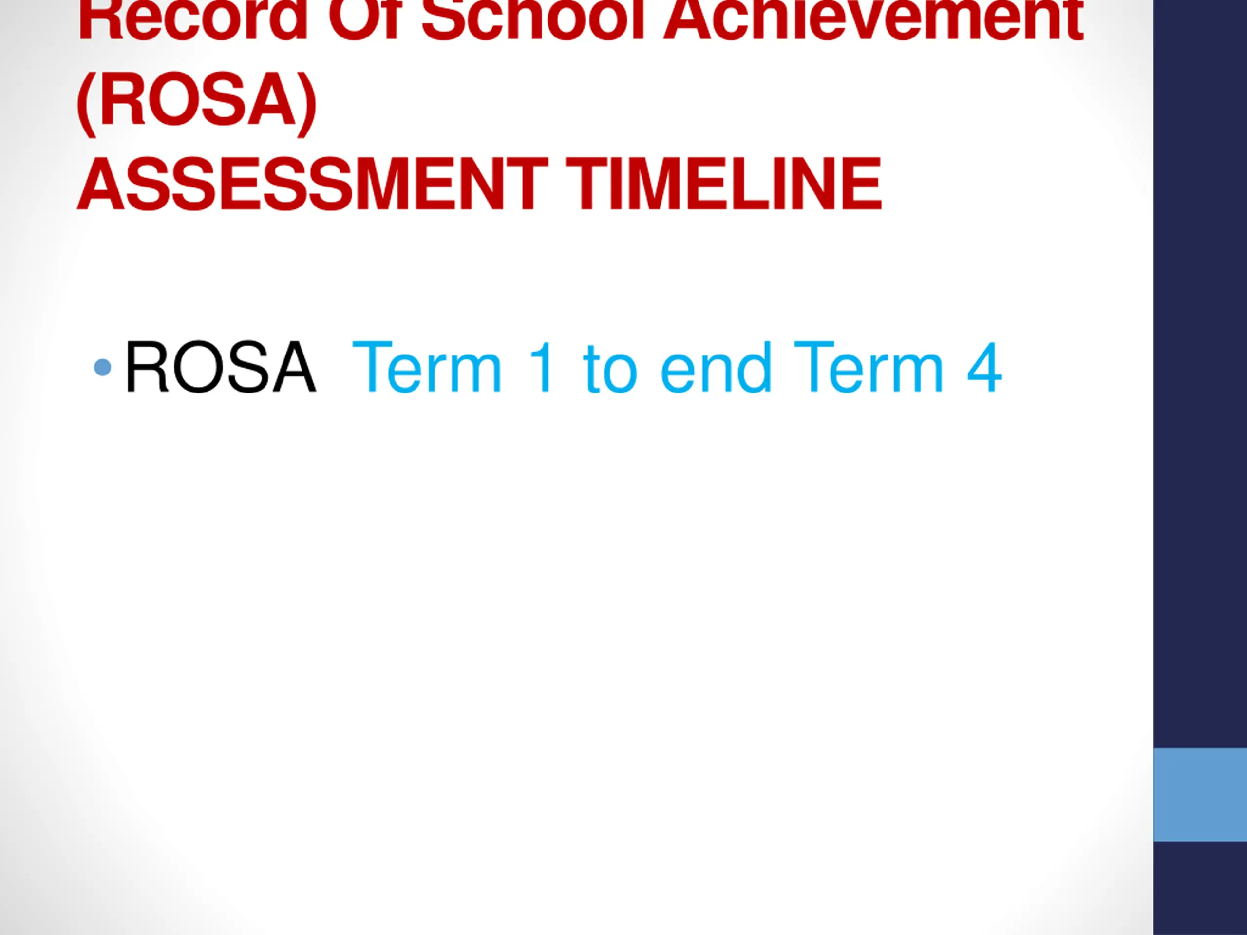 Record Of School Achievement (ROSA) ASSESSMENT TIMELINE ROSA Term 1 to end Term 4