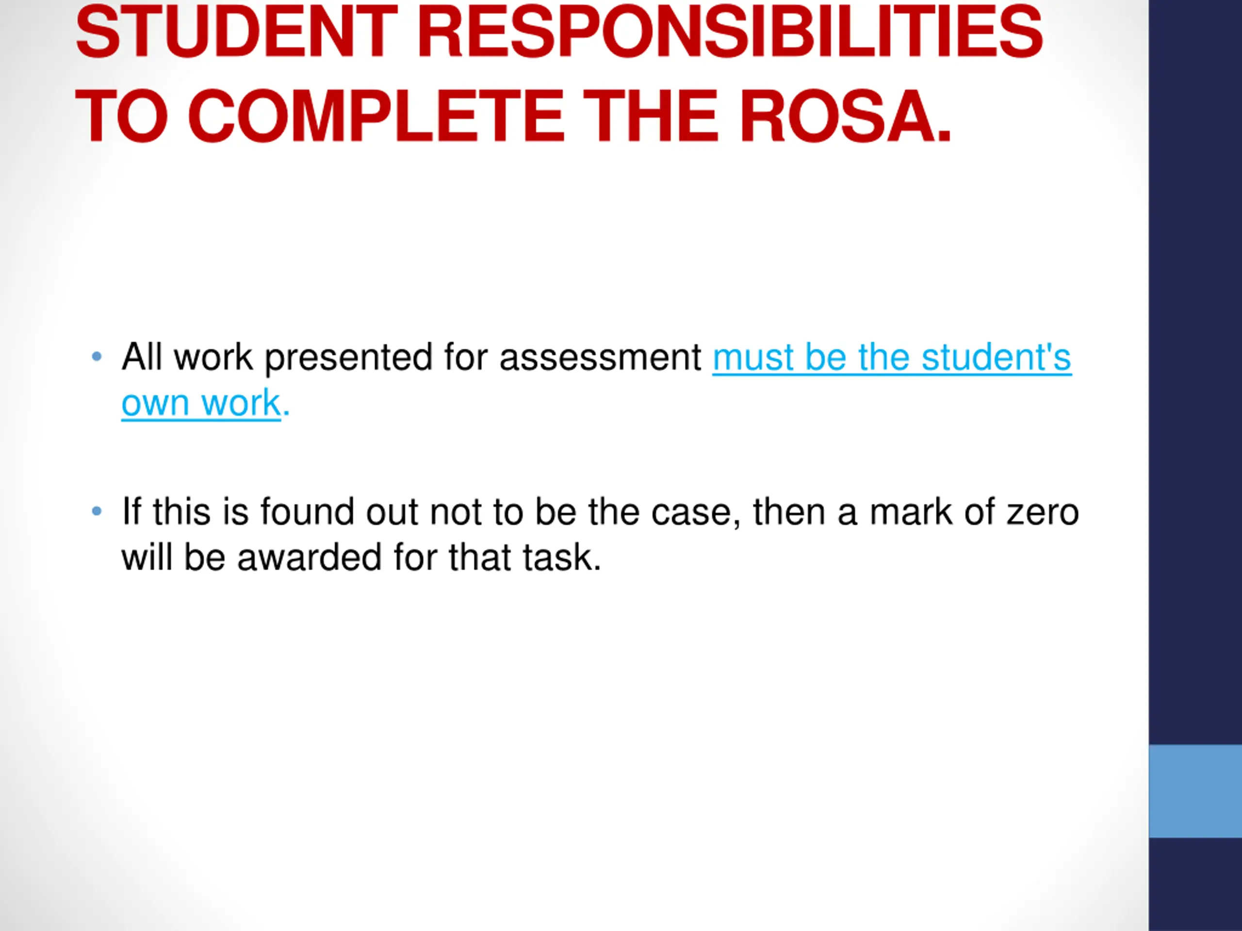 STUDENT RESPONSIBILITIES TO COMPLETE THE ROSA. All work presented for assessment must be the student's own work. If this is found out not to be the case, then a mark of zero will be awarded for that task.