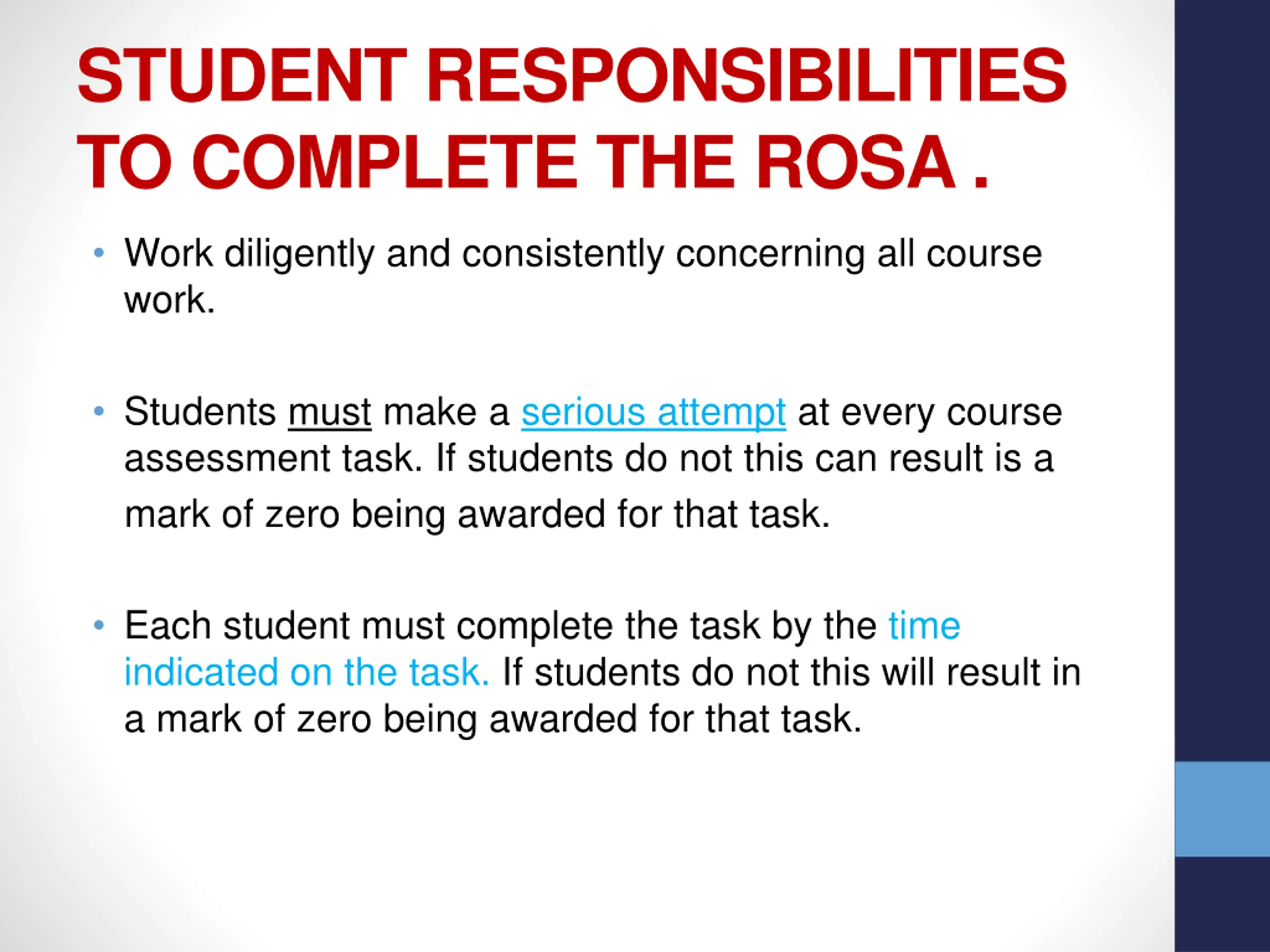 STUDENT RESPONSIBILITIES TO COMPLETE THE ROSA . Work diligently and consistently concerning all course work. Students must make a serious attempt at every course assessment task. If students do not this can result is a mark of zero being awarded for that task. Each student must complete the task by the time indicated on the task. If students do not this will result in a mark of zero being awarded for that task.