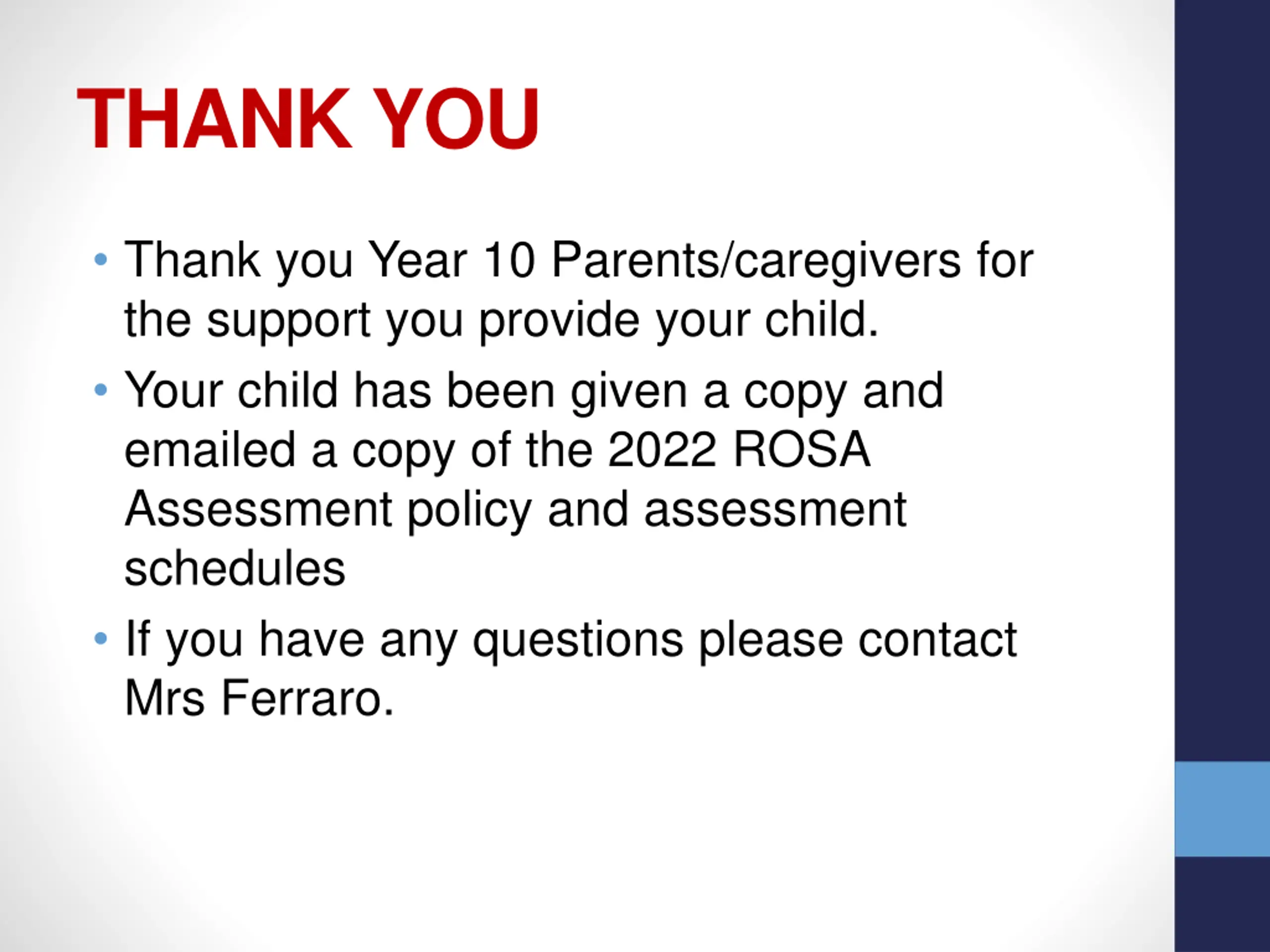 THANK YOU Thank you Year 10 Parents/caregivers for the support you provide your child. Your child has been given a copy and emailed a copy of the 2022 ROSA Assessment policy and assessment schedules If you have any questions please contact Mrs Ferraro.