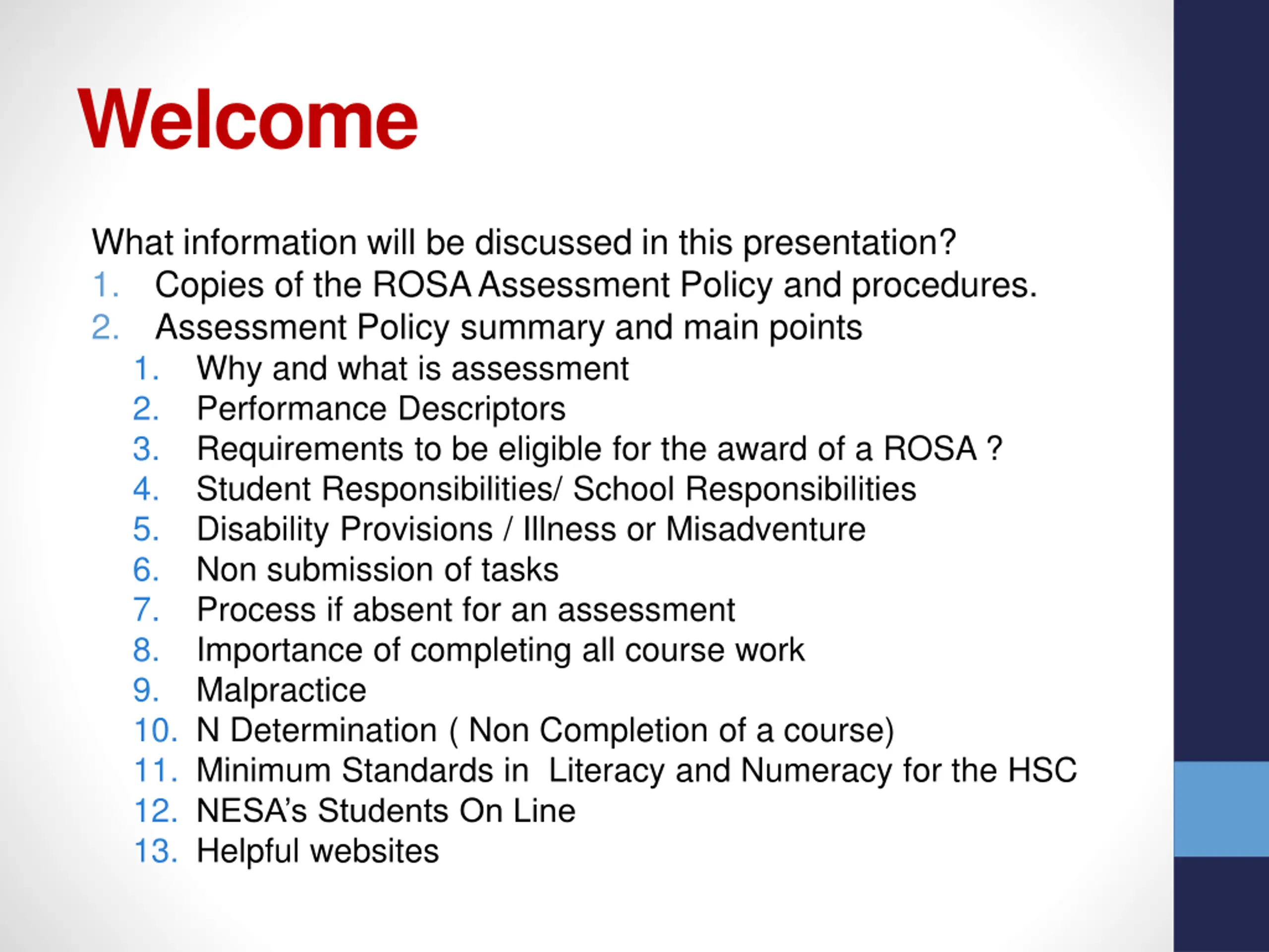 Welcome What information will be discussed in this presentation? 1. Copies of the ROSA Assessment Policy and procedures. 2. Assessment Policy summary and main points 1. Why and what is assessment 2. Performance Descriptors 3. Requirements to be eligible for the award of a ROSA ? 4. Student Responsibilities/ School Responsibilities 5. Disability Provisions / Illness or Misadventure 6. Non submission of tasks 7. Process if absent for an assessment 8. Importance of completing all course work 9. Malpractice 10. N Determination ( Non Completion of a course) 11. Minimum Standards in Literacy and Numeracy for the HSC 12. NESA s Students On Line 13. Helpful websites
