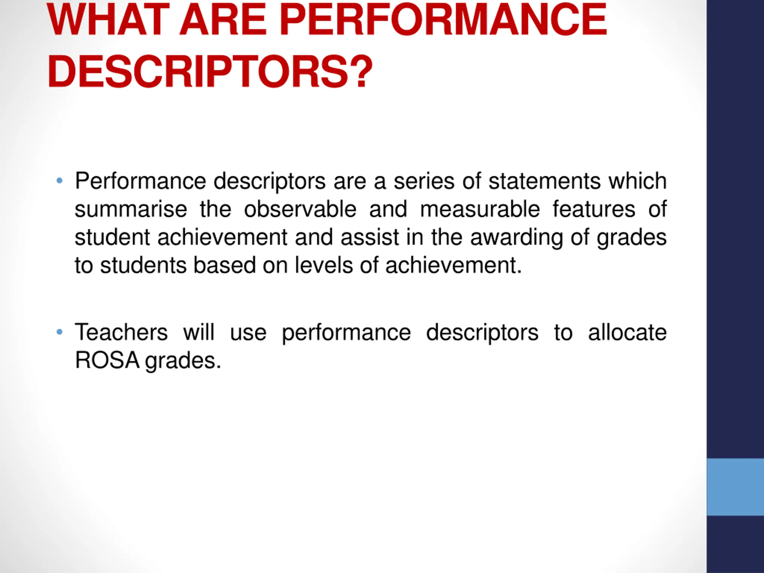 WHAT ARE PERFORMANCE DESCRIPTORS? Performance descriptors are a series of statements which summarise the observable and measurable features of student achievement and assist in the awarding of grades to students based on levels of achievement. Teachers will use performance descriptors to allocate ROSA grades.