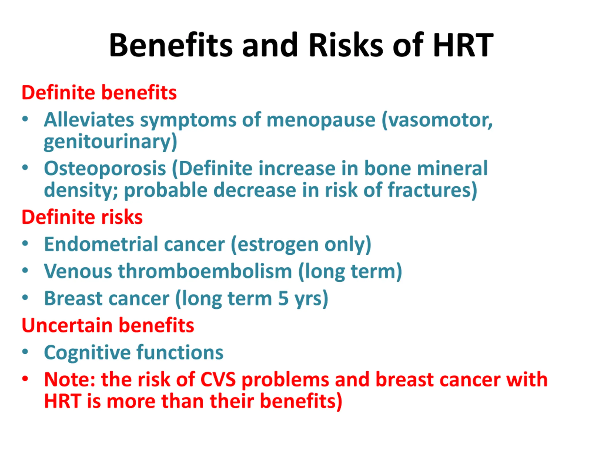 Benefits and Risks of HRT Definite benefits Alleviates symptoms of menopause (vasomotor, genitourinary) Osteoporosis (Definite increase in bone mineral density; probable decrease in risk of fractures) Definite risks Endometrial cancer (estrogen only) Venous thromboembolism (long term) Breast cancer (long term 5 yrs) Uncertain benefits Cognitive functions Note: the risk of CVS problems and breast cancer with HRT is more than their benefits)