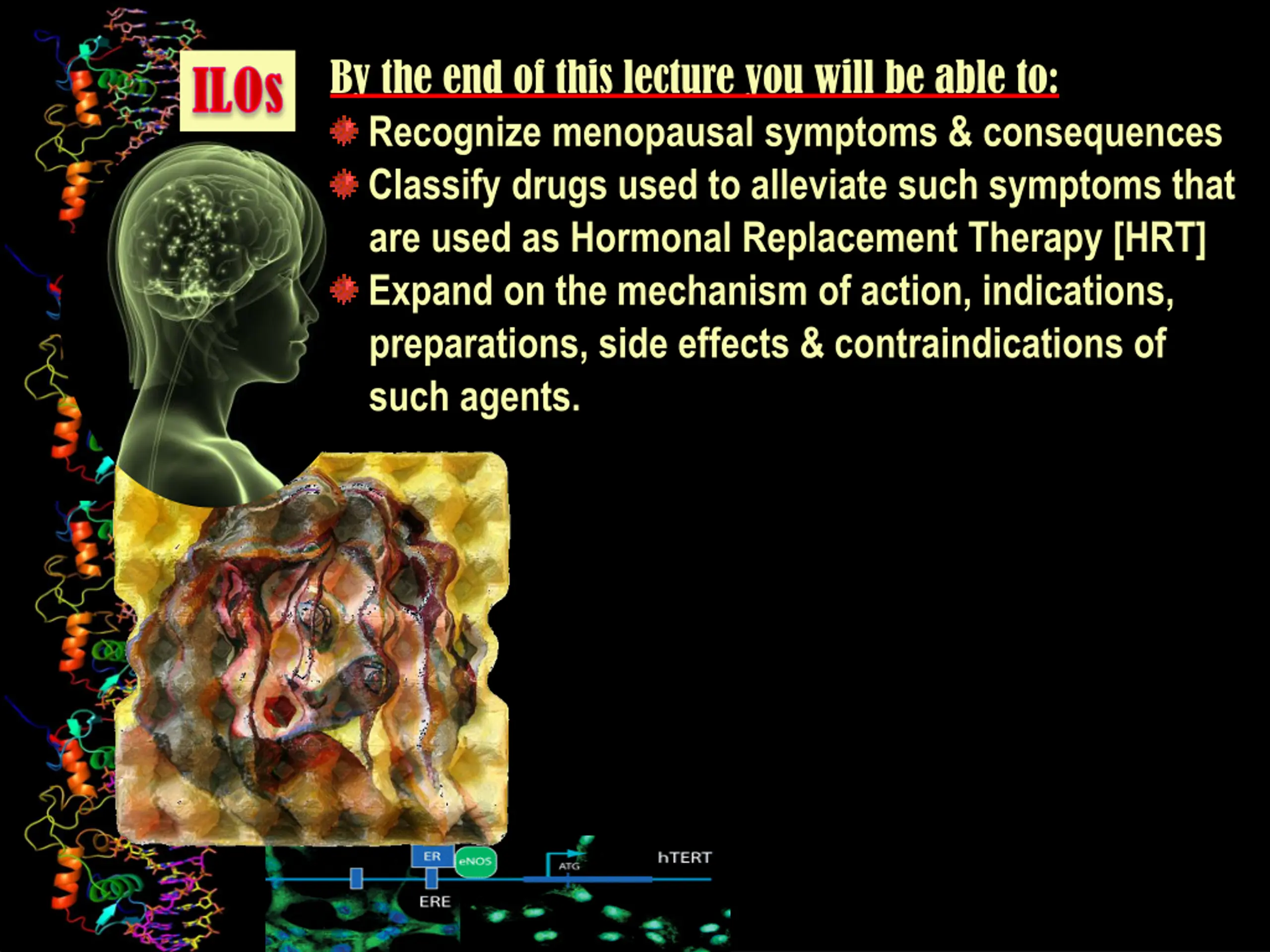 By the end of this lecture you will be able to: Recognize menopausal symptoms & consequences Classify drugs used to alleviate such symptoms that are used as Hormonal Replacement Therapy [HRT] Expand on the mechanism of action, indications, preparations, side effects & contraindications of such agents.