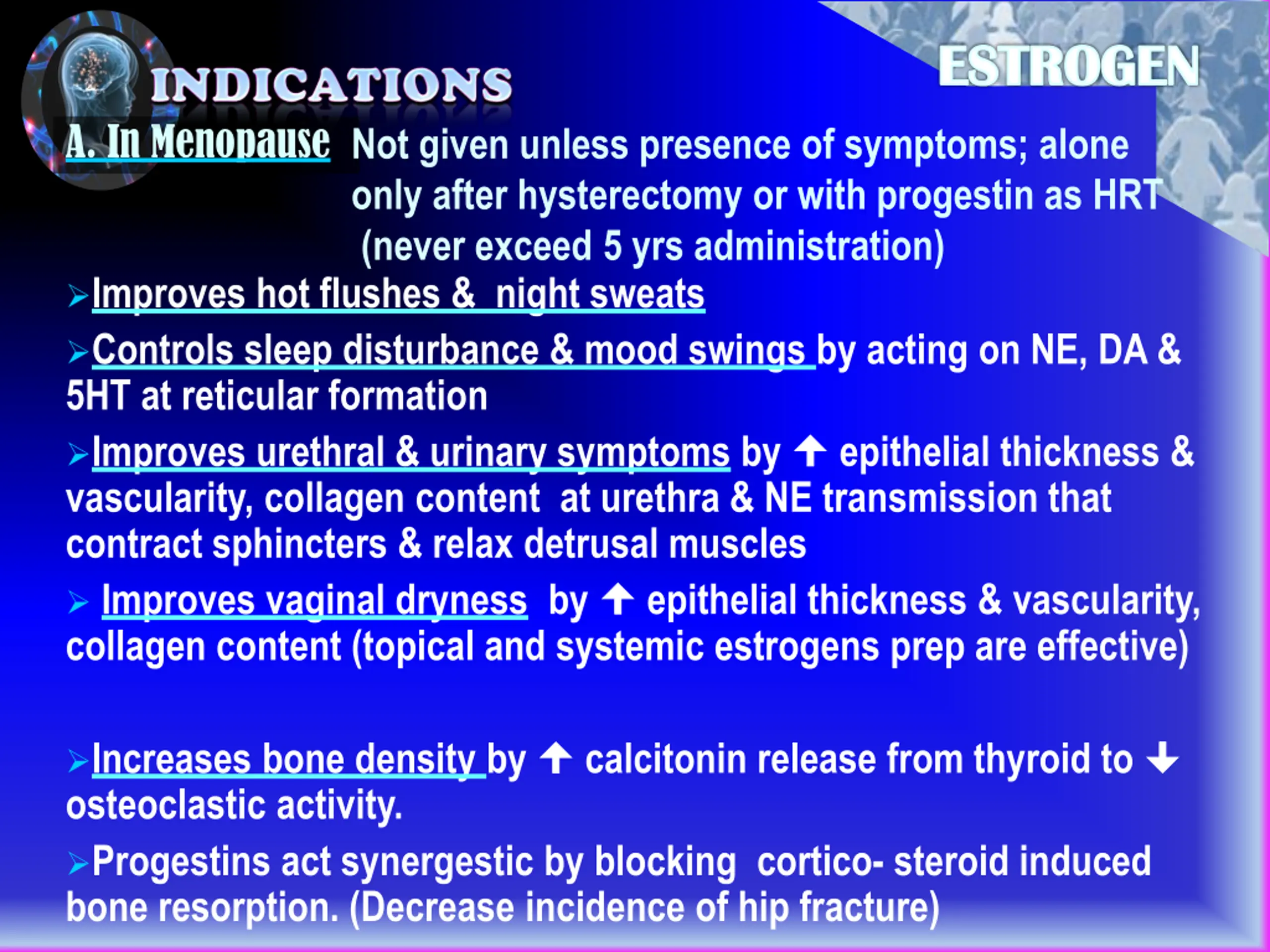 ESTROGEN A. In Menopause Not given unless presence of symptoms; alone only after hysterectomy or with progestin as HRT (never exceed 5 yrs administration) Improves hot flushes & night sweats Controls sleep disturbance & mood swings by acting on NE, DA & 5HT at reticular formation Improves urethral & urinary symptoms by vascularity, collagen content at urethra & NE transmission that contract sphincters & relax detrusal muscles Improves vaginal dryness by epithelial thickness & vascularity, collagen content (topical and systemic estrogens prep are effective) epithelial thickness & Increases bone density by osteoclastic activity. Progestins act synergestic by blocking cortico- steroid induced bone resorption. (Decrease incidence of hip fracture) calcitonin release from thyroid to