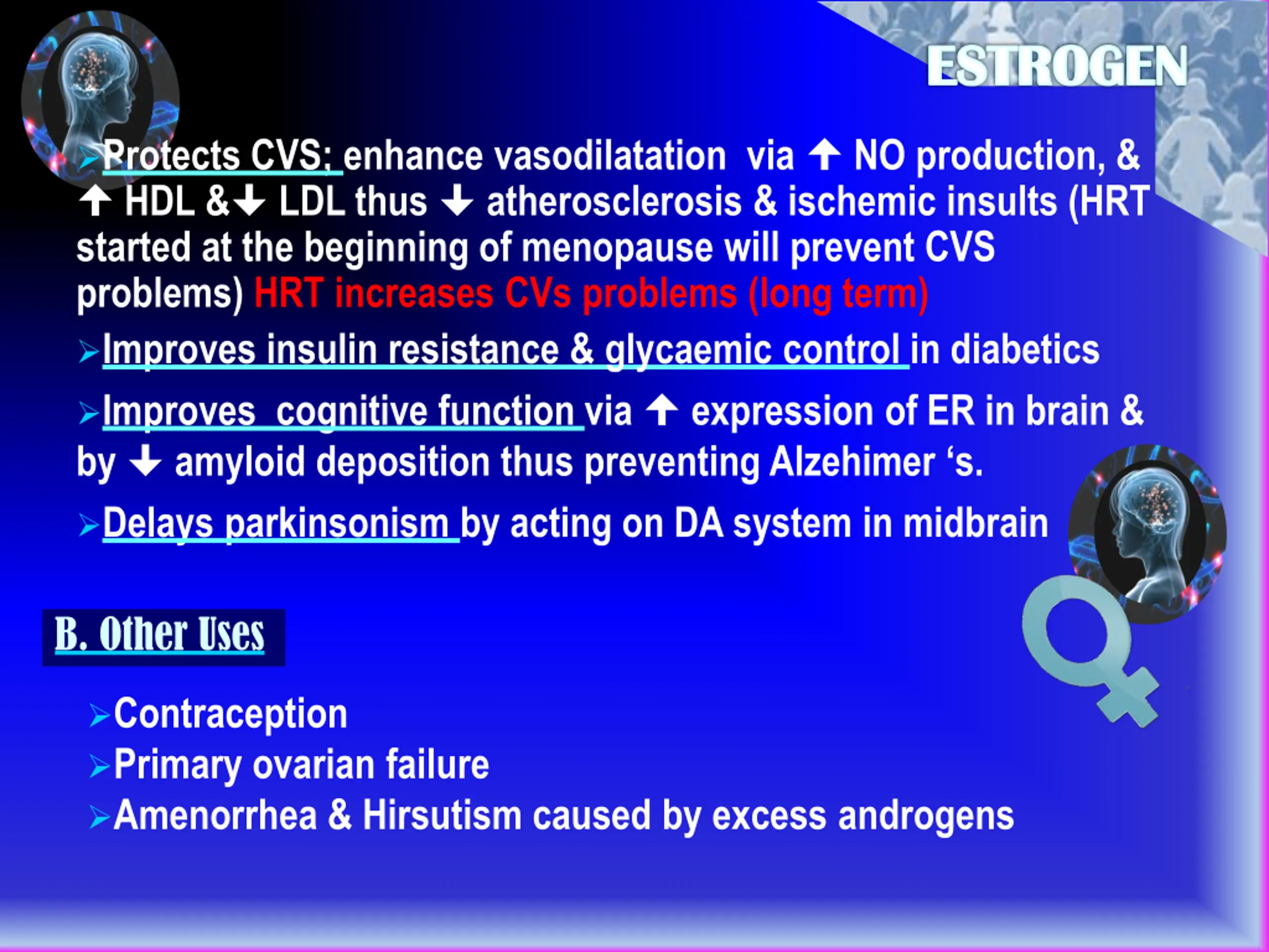 ESTROGEN Protects CVS; enhance vasodilatation via HDL & LDL thus atherosclerosis & ischemic insults (HRT started at the beginning of menopause will prevent CVS problems) HRT increases CVs problems (long term) Improves insulin resistance & glycaemic control in diabetics Improves cognitive function via by amyloid deposition thus preventing Alzehimer s. Delays parkinsonism by acting on DA system in midbrain NO production, & expression of ER in brain & B. Other Uses Contraception Primary ovarian failure Amenorrhea & Hirsutism caused by excess androgens