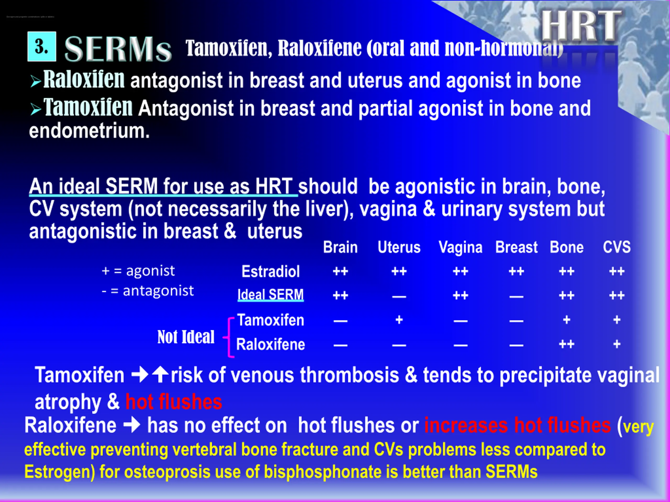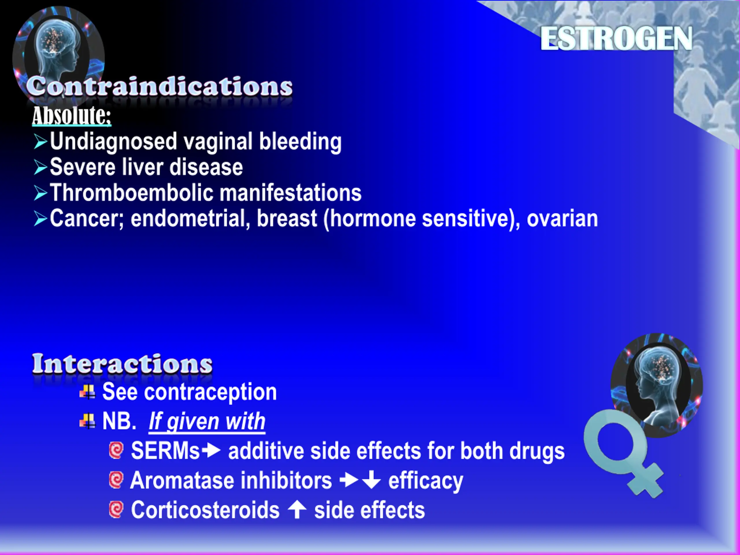 ESTROGEN Absolute; Undiagnosed vaginal bleeding Severe liver disease Thromboembolic manifestations Cancer; endometrial, breast (hormone sensitive), ovarian See contraception NB. If given with SERMs additive side effects for both drugs Aromatase inhibitors Corticosteroids side effects efficacy
