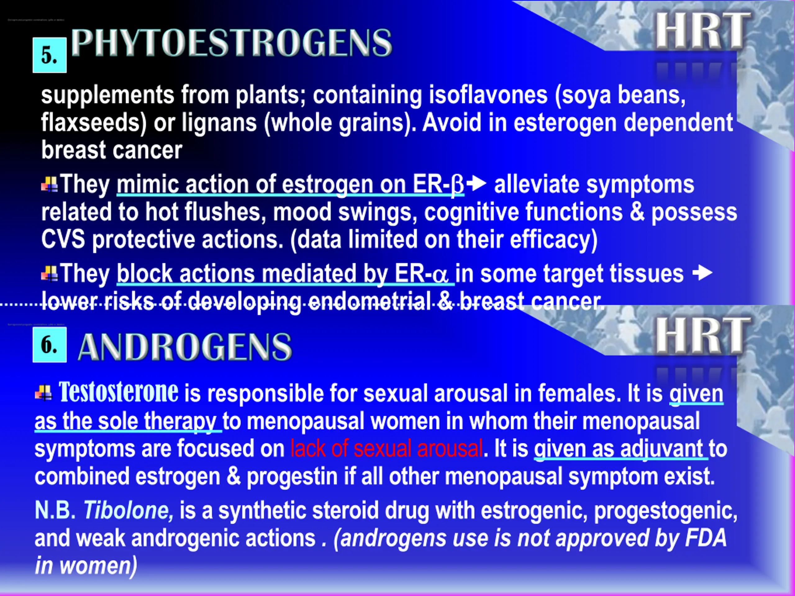 Estrogen and progestin combinations (pills or tablets) 5. supplements from plants; containing isoflavones (soya beans, flaxseeds) or lignans (whole grains). Avoid in esterogen dependent breast cancer They mimic action of estrogen on ER- alleviate symptoms related to hot flushes, mood swings, cognitive functions & possess CVS protective actions. (data limited on their efficacy) They block actions mediated by ER- in some target tissues lower risks of developing endometrial & breast cancer. Estrogen and progestin combinations (pills or tablets) 6. Testosterone is responsible for sexual arousal in females. It is given as the sole therapy to menopausal women in whom their menopausal symptoms are focused on lack of sexual arousal. It is given as adjuvant to combined estrogen & progestin if all other menopausal symptom exist. N.B. Tibolone, is a synthetic steroid drug with estrogenic, progestogenic, and weak androgenic actions . (androgens use is not approved by FDA in women)