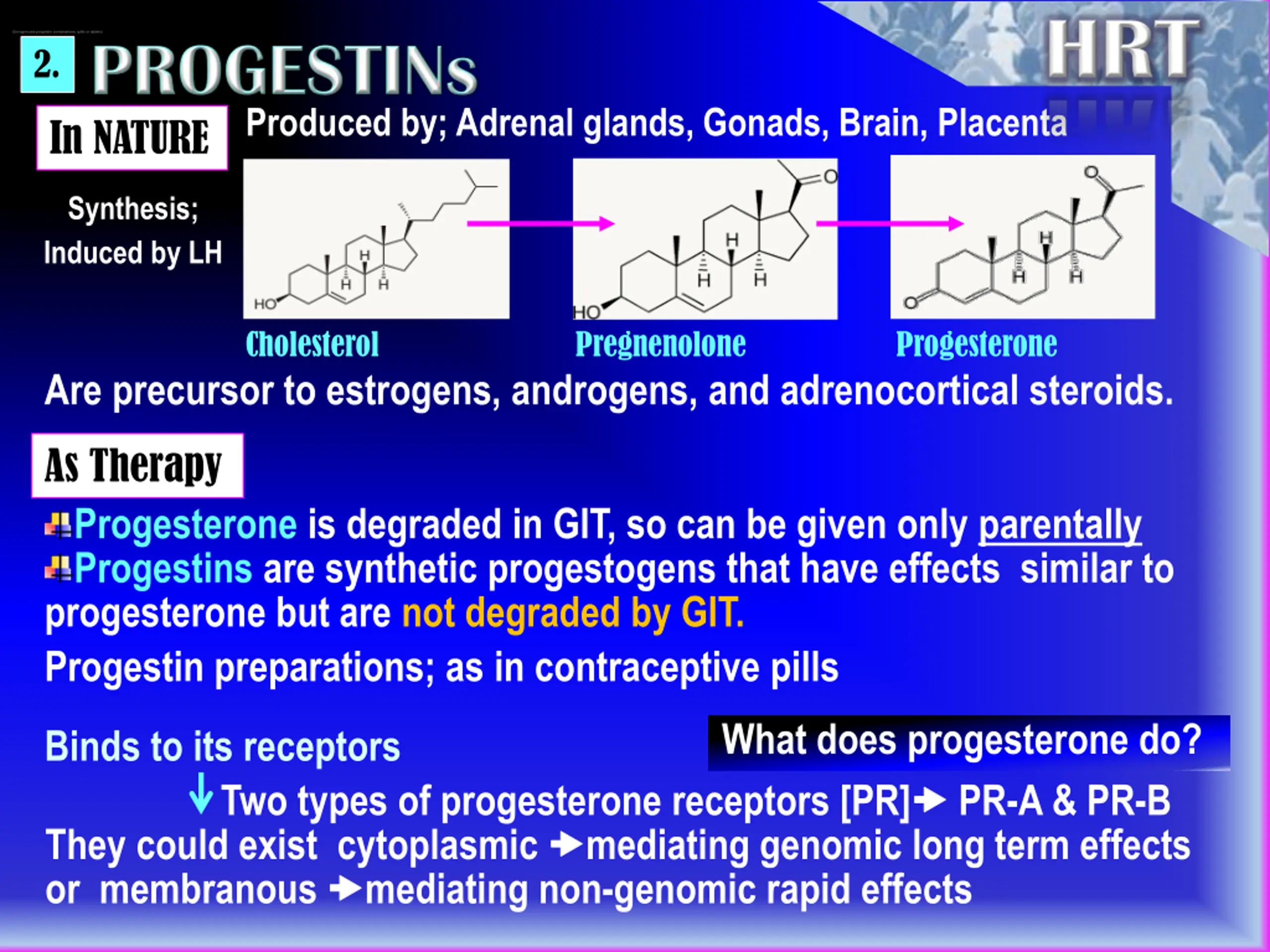 Estrogen and progestin combinations (pills or tablets) 2. Produced by; Adrenal glands, Gonads, Brain, Placenta In NATURE Synthesis; Induced by LH Cholesterol Pregnenolone Progesterone Are precursor to estrogens, androgens, and adrenocortical steroids. As Therapy Progesterone is degraded in GIT, so can be given only parentally Progestins are synthetic progestogens that have effects similar to progesterone but are not degraded by GIT. Progestin preparations; as in contraceptive pills What does progesterone do? Binds to its receptors Two types of progesterone receptors [PR] PR-A & PR-B They could exist cytoplasmic mediating genomic long term effects or membranous mediating non-genomic rapid effects