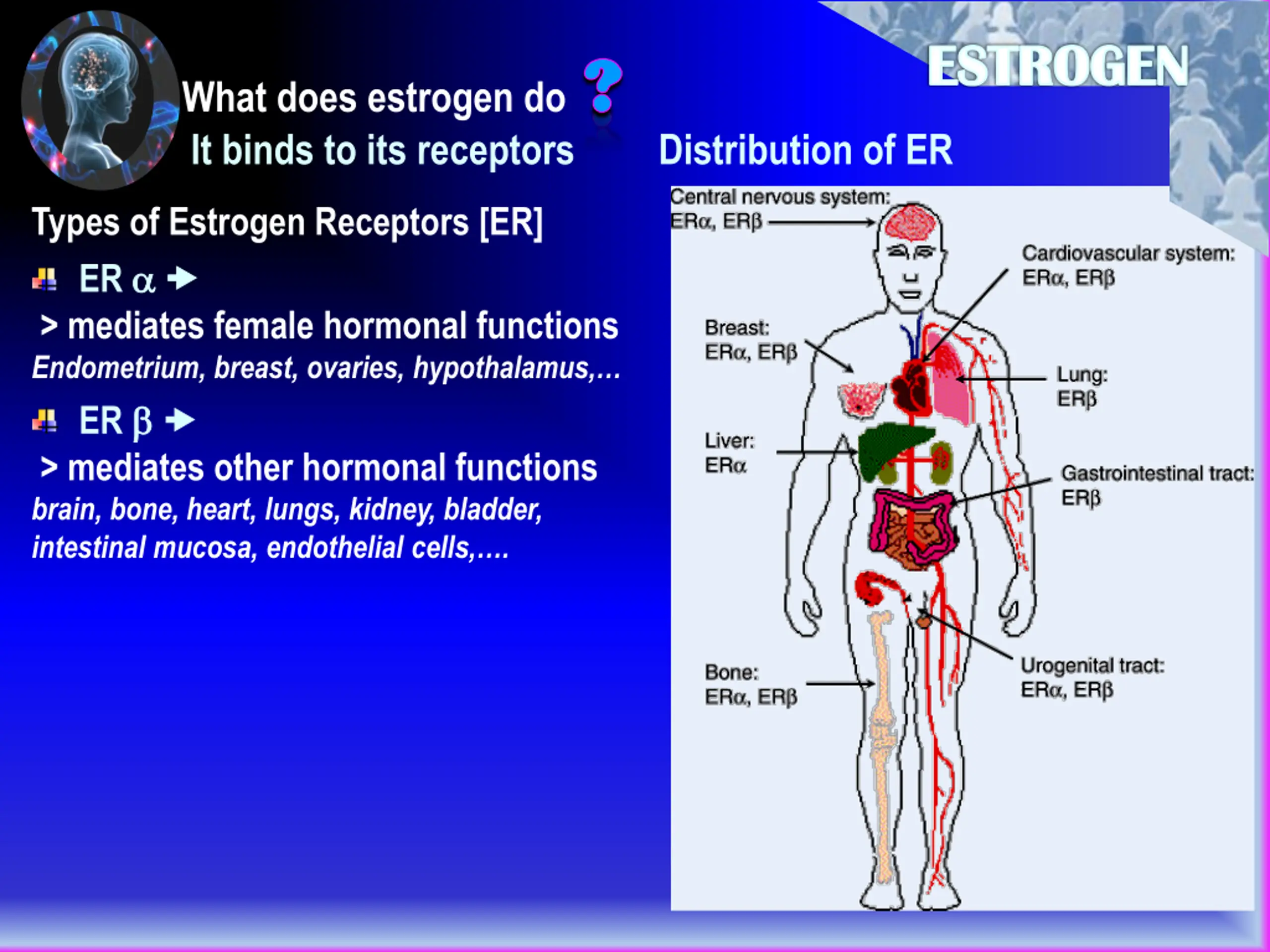 ESTROGEN ? ? What does estrogen do It binds to its receptors Distribution of ER Types of Estrogen Receptors [ER] ER > mediates female hormonal functions Endometrium, breast, ovaries, hypothalamus, ER > mediates other hormonal functions brain, bone, heart, lungs, kidney, bladder, intestinal mucosa, endothelial cells, .