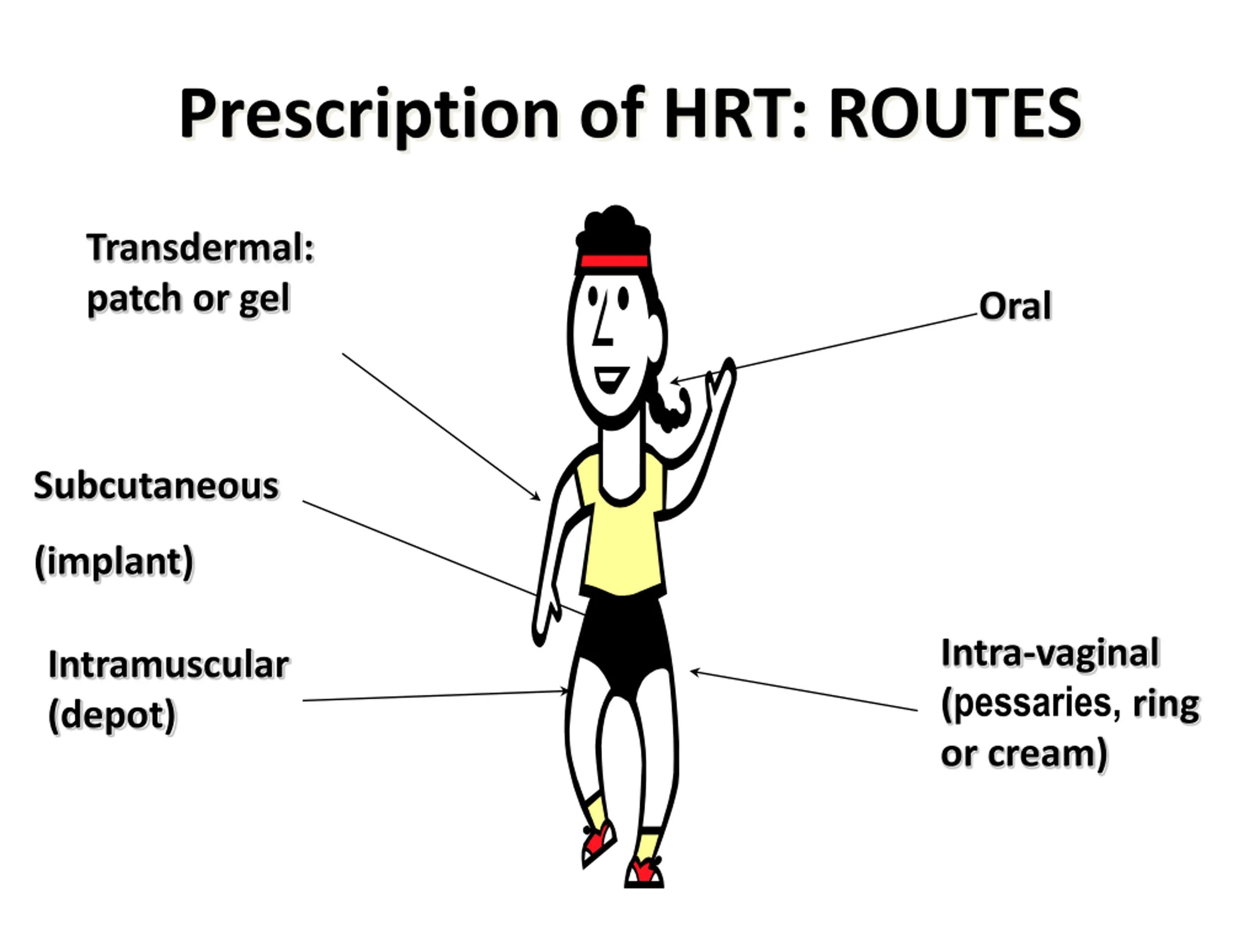 Prescription of HRT: ROUTES Transdermal: patch or gel Oral Subcutaneous (implant) Intra-vaginal (pessaries, ring or cream) Intramuscular (depot)