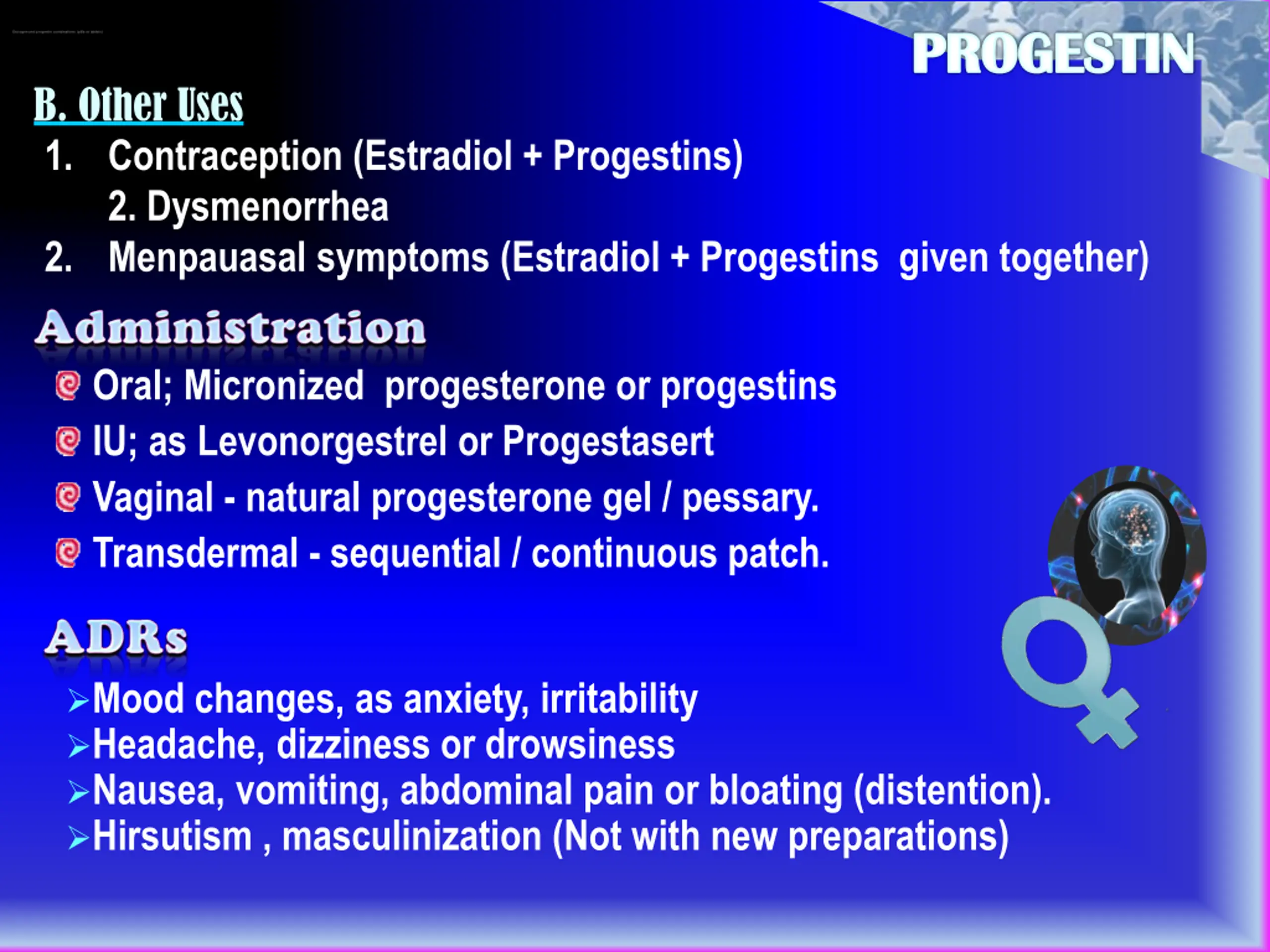 PROGESTIN Estrogen and progestin combinations (pills or tablets) B. Other Uses 1. Contraception (Estradiol + Progestins) 2. Dysmenorrhea 2. Menpauasal symptoms (Estradiol + Progestins given together) Oral; Micronized progesterone or progestins IU; as Levonorgestrel or Progestasert Vaginal - naturalprogesterone gel / pessary. Transdermal -sequential / continuous patch. Mood changes, as anxiety, irritability Headache, dizziness or drowsiness Nausea, vomiting, abdominal pain or bloating (distention). Hirsutism , masculinization (Not with new preparations)