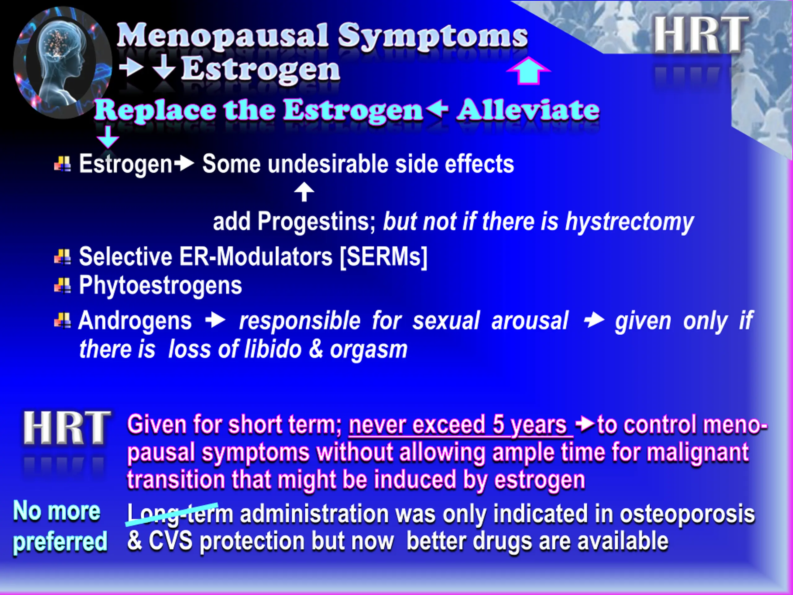 Replace the Estrogen Replace the Estrogen Alleviate Alleviate Estrogen Some undesirable side effects add Progestins; but not if there is hystrectomy Selective ER-Modulators [SERMs] Phytoestrogens Androgens responsible for sexual arousal given only if there is loss of libido & orgasm Given for short term; never exceed 5 years to control meno- pausal symptoms without allowing ample time for malignant transition that might be induced by estrogen Long-term administration was only indicated in osteoporosis & CVS protection but now better drugs are available No more preferred