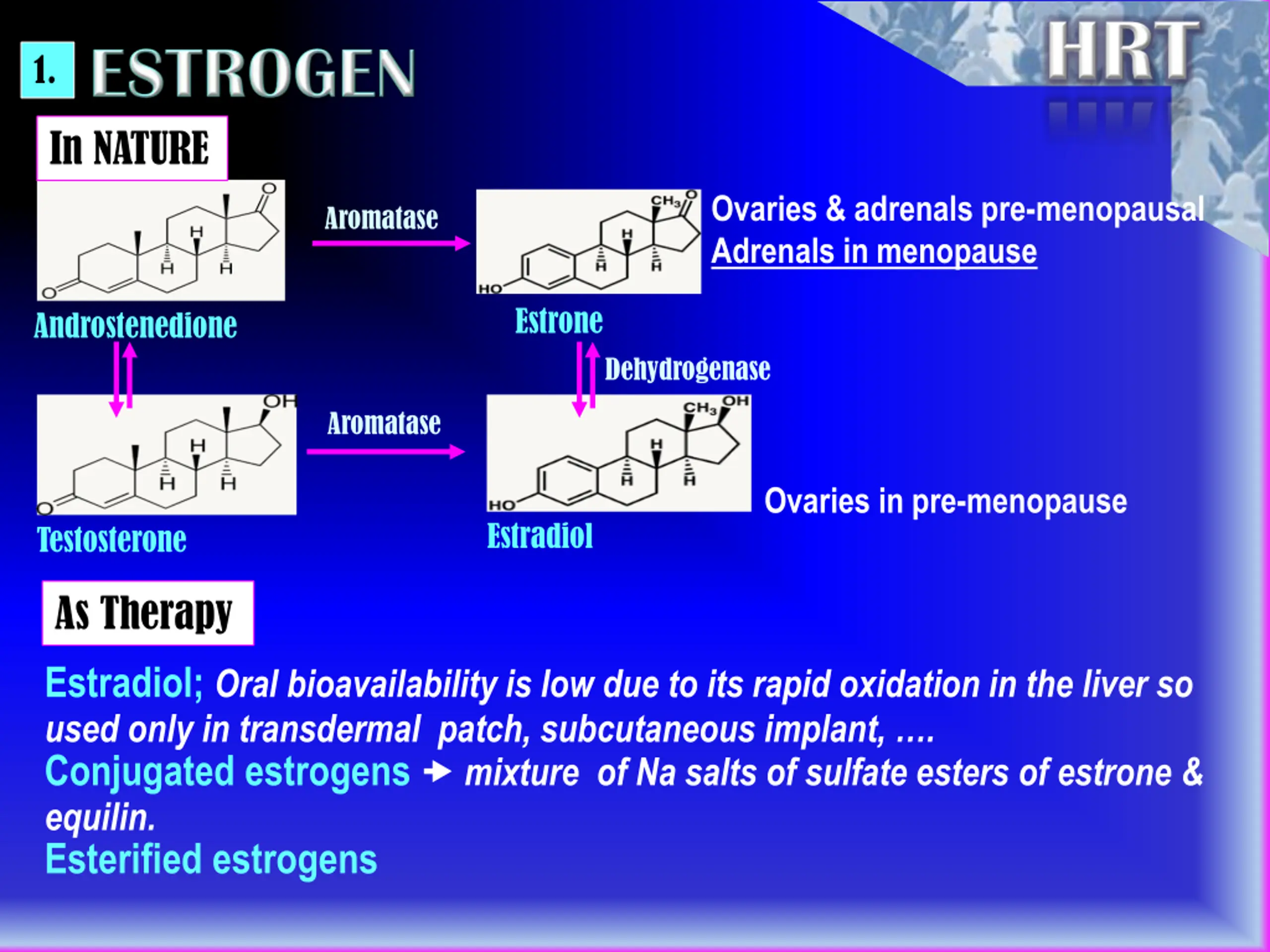1. In NATURE Ovaries & adrenals pre-menopausal Adrenals in menopause Aromatase Estrone Androstenedione Dehydrogenase Aromatase Ovaries in pre-menopause Estradiol Testosterone As Therapy Estradiol; Oral bioavailability is low due to its rapid oxidation in the liver so used only in transdermal patch, subcutaneous implant, . Conjugated estrogens mixture of Na salts of sulfate esters of estrone & equilin. Esterified estrogens