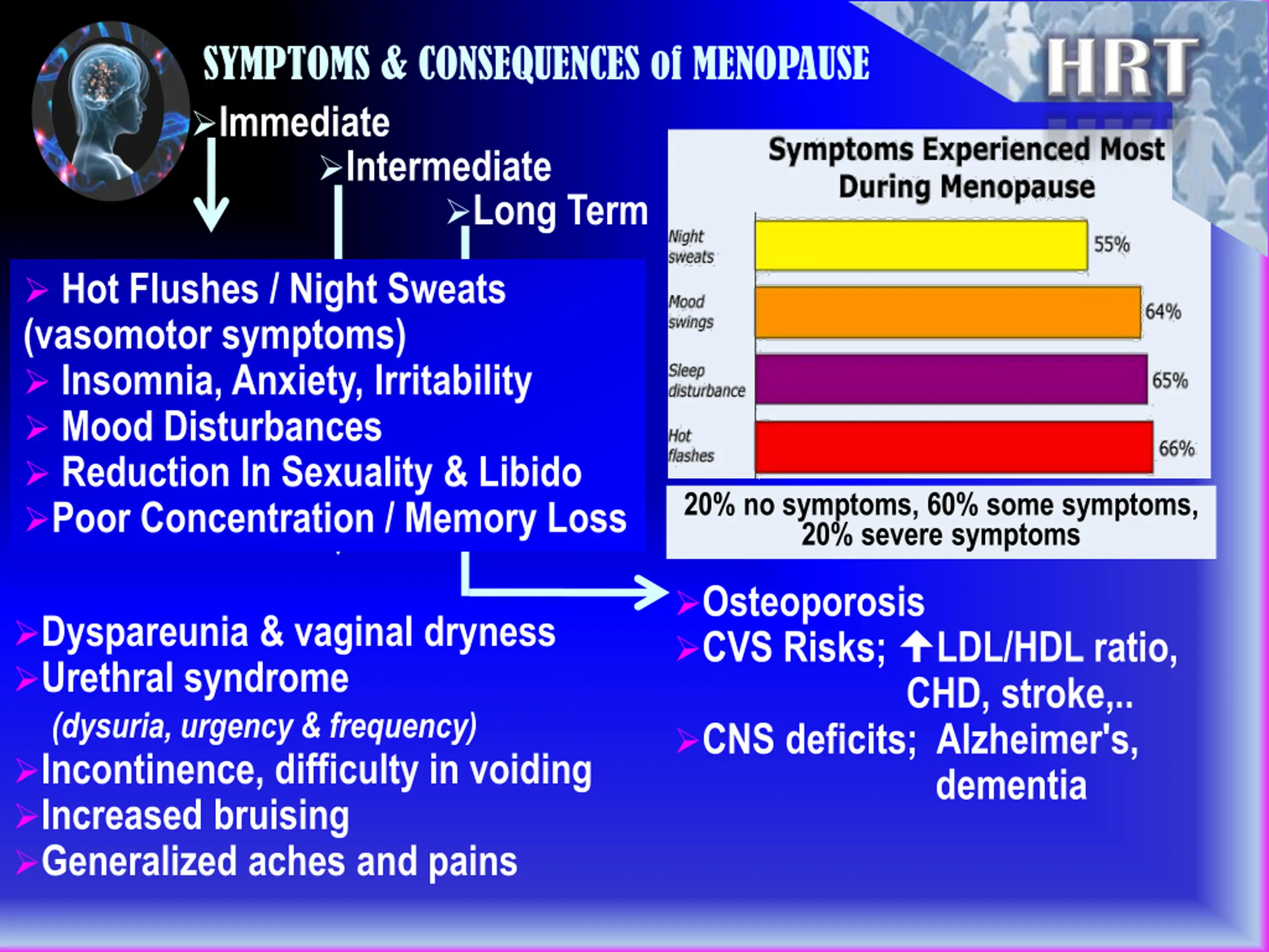 SYMPTOMS & CONSEQUENCES of MENOPAUSE Immediate Intermediate Long Term Hot Flushes / Night Sweats (vasomotor symptoms) Insomnia, Anxiety, Irritability Mood Disturbances Reduction In Sexuality & Libido Poor Concentration / Memory Loss 20% no symptoms, 60% some symptoms, 20% severe symptoms Osteoporosis CVS Risks; CHD, stroke,.. CNS deficits; Alzheimer's, dementia Dyspareunia & vaginal dryness Urethral syndrome (dysuria, urgency & frequency) Incontinence, difficulty in voiding Increased bruising Generalized aches and pains LDL/HDL ratio,