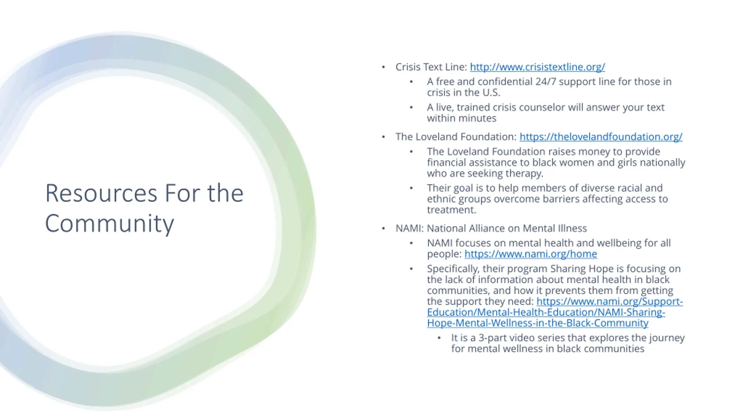 Crisis Text Line: http://www.crisistextline.org/ A free and confidential 24/7 support line for those in crisis in the U.S. A live, trained crisis counselor will answer your text within minutes The Loveland Foundation: https://thelovelandfoundation.org/ The Loveland Foundation raises money to provide financial assistance to black women and girls nationally who are seeking therapy. Their goal is to help members of diverse racial and ethnic groups overcome barriers affecting access to treatment. NAMI: National Alliance on Mental Illness NAMI focuses on mental health and wellbeing for all people: https://www.nami.org/home Specifically, their program Sharing Hope is focusing on the lack of information about mental health in black communities, and how it prevents them from getting the support they need: https://www.nami.org/Support- Education/Mental-Health-Education/NAMI-Sharing- Hope-Mental-Wellness-in-the-Black-Community It is a 3-part video series that explores the journey for mental wellness in black communities Resources For the Community