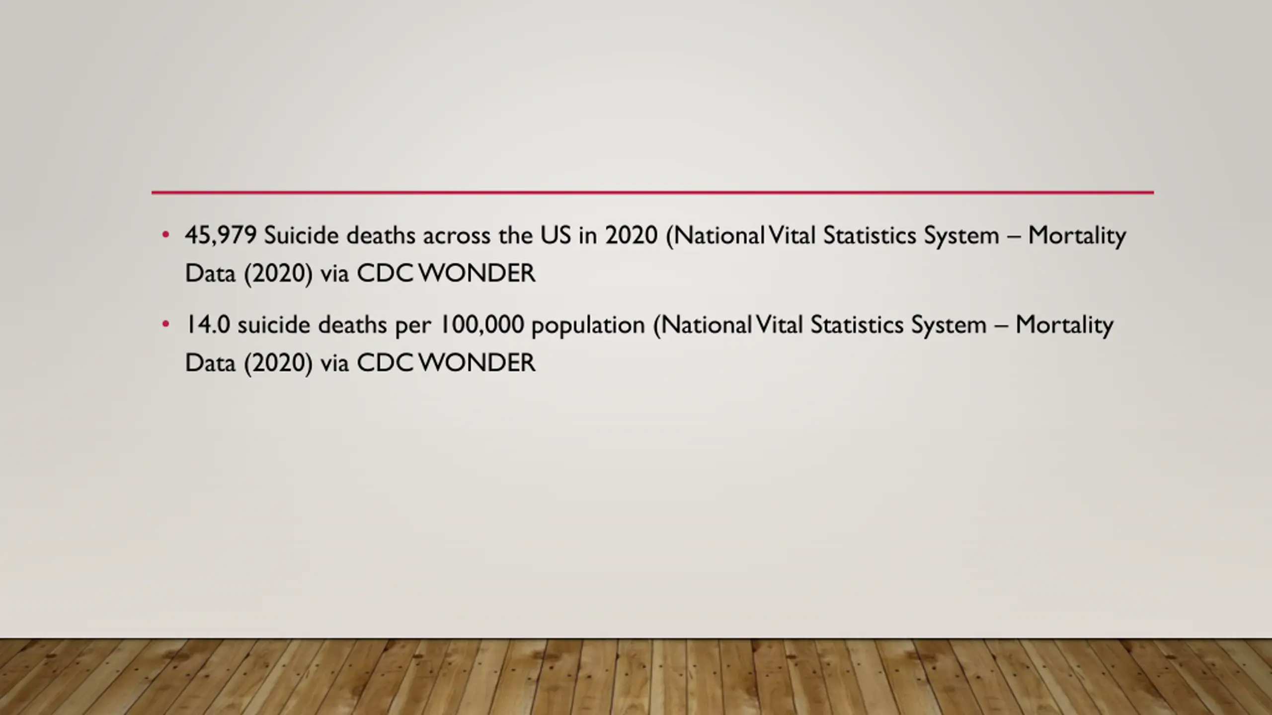 45,979 Suicide deaths across the US in 2020 (National Vital Statistics System Mortality Data (2020) via CDC WONDER 14.0 suicide deaths per 100,000 population (National Vital Statistics System Mortality Data (2020) via CDC WONDER