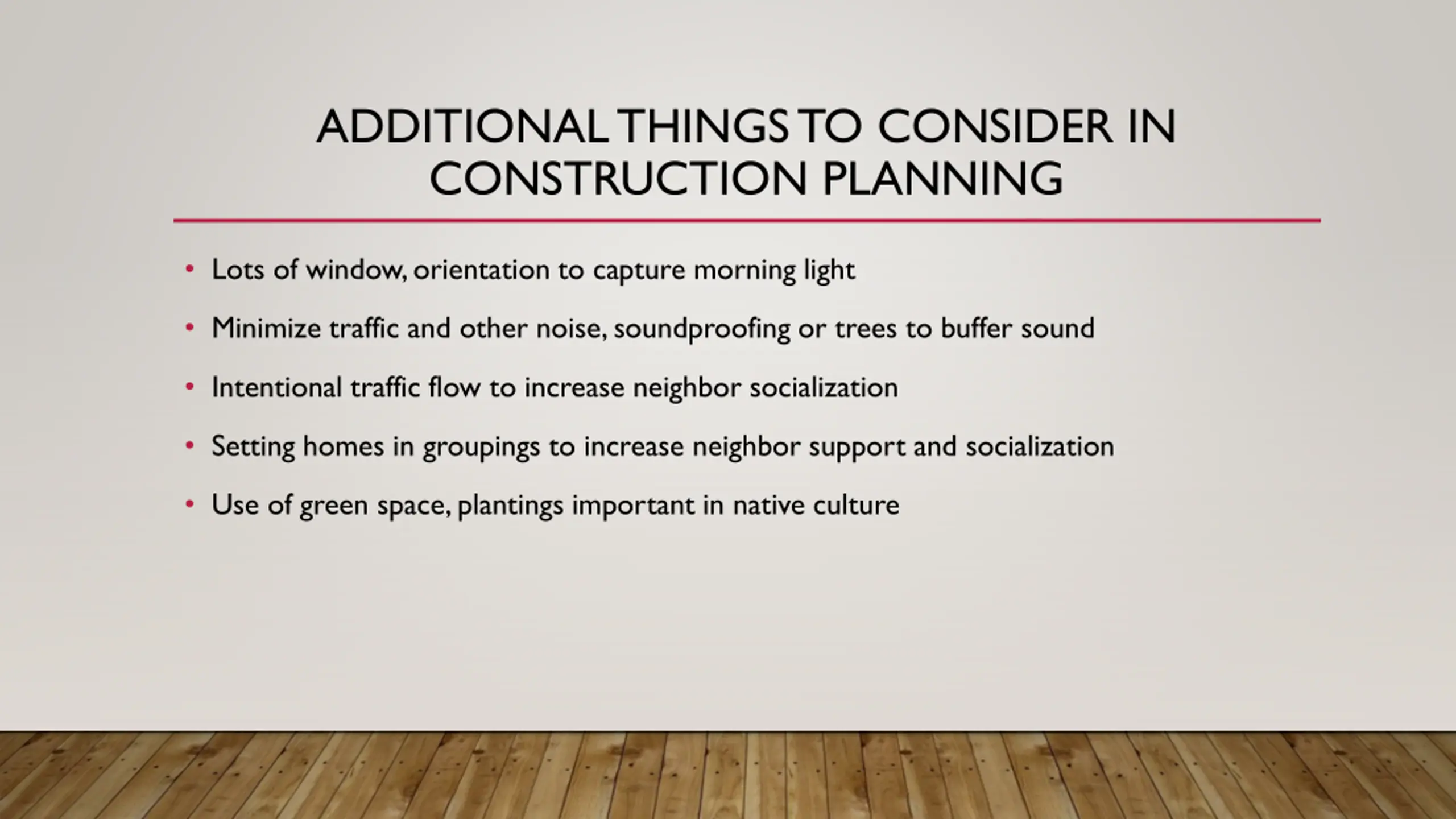 ADDITIONAL THINGS TO CONSIDER IN CONSTRUCTION PLANNING Lots of window, orientation to capture morning light Minimize traffic and other noise, soundproofing or trees to buffer sound Intentional traffic flow to increase neighbor socialization Setting homes in groupings to increase neighbor support and socialization Use of green space, plantings important in native culture