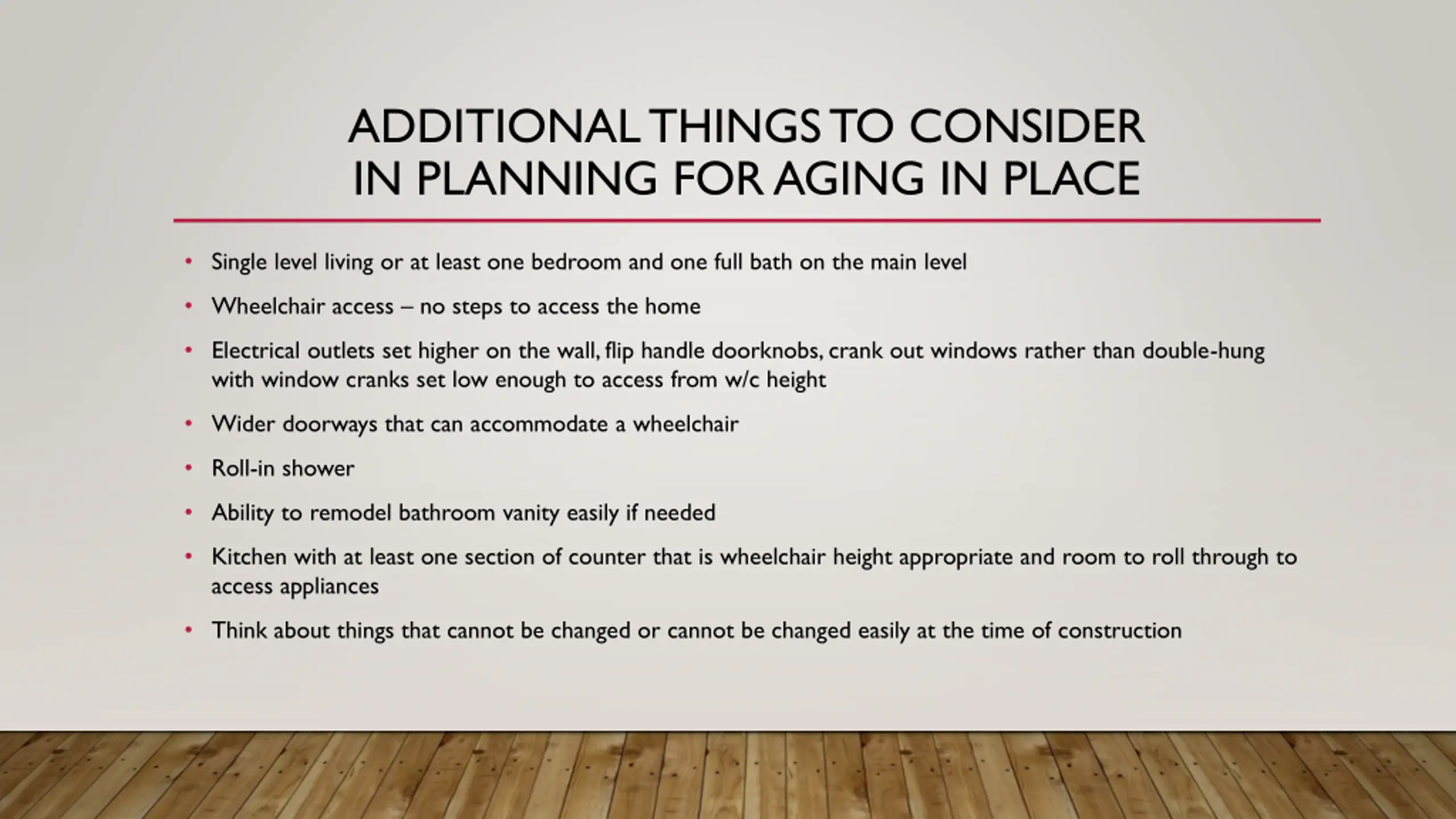 ADDITIONAL THINGS TO CONSIDER IN PLANNING FOR AGING IN PLACE Single level living or at least one bedroom and one full bath on the main level Wheelchair access no steps to access the home Electrical outlets set higher on the wall, flip handle doorknobs, crank out windows rather than double-hung with window cranks set low enough to access from w/c height Wider doorways that can accommodate a wheelchair Roll-in shower Ability to remodel bathroom vanity easily if needed Kitchen with at least one section of counter that is wheelchair height appropriate and room to roll through to access appliances Think about things that cannot be changed or cannot be changed easily at the time of construction