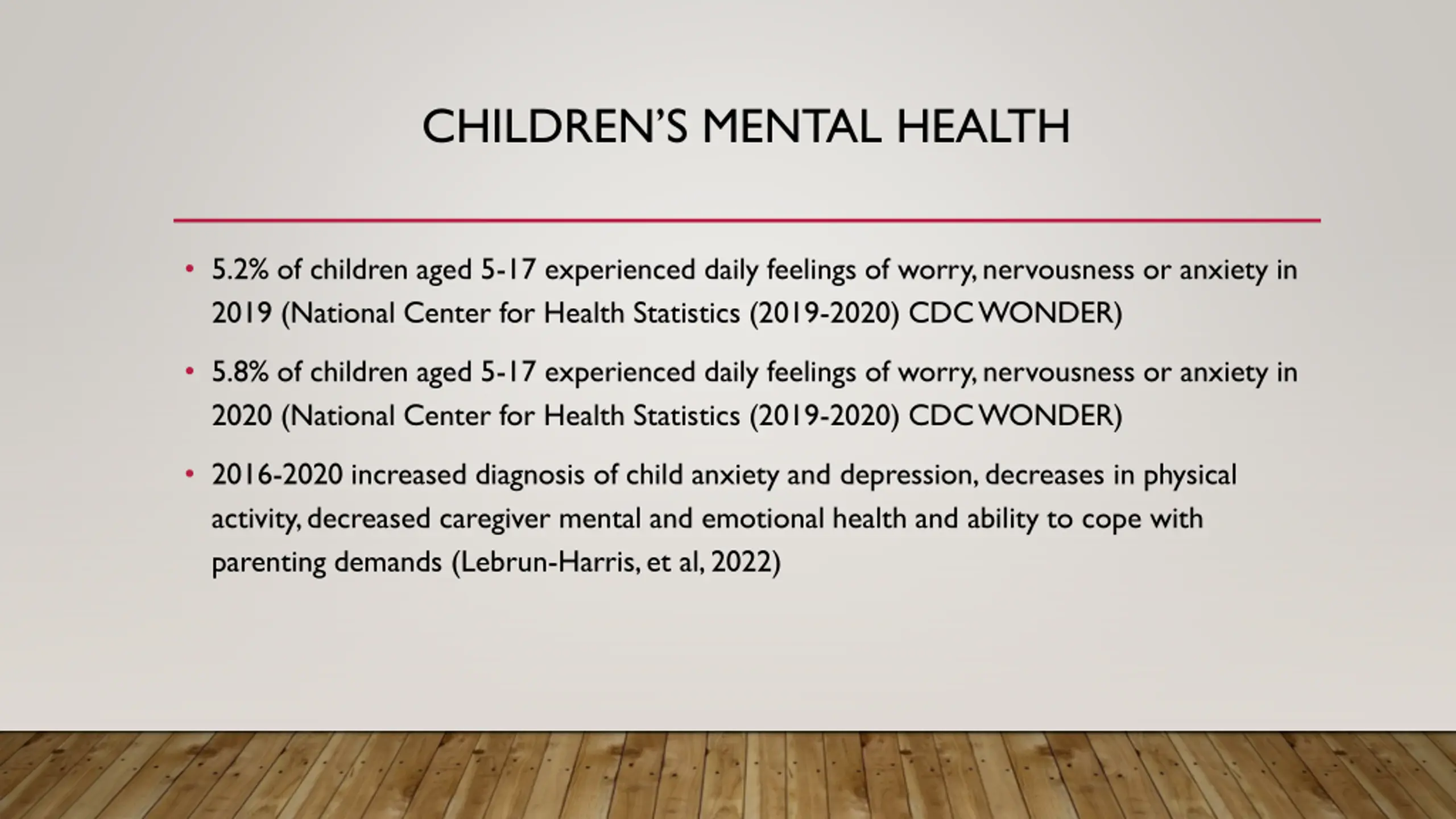 CHILDRENS MENTAL HEALTH 5.2% of children aged 5-17 experienced daily feelings of worry, nervousness or anxiety in 2019 (National Center for Health Statistics (2019-2020) CDC WONDER) 5.8% of children aged 5-17 experienced daily feelings of worry, nervousness or anxiety in 2020 (National Center for Health Statistics (2019-2020) CDC WONDER) 2016-2020 increased diagnosis of child anxiety and depression, decreases in physical activity, decreased caregiver mental and emotional health and ability to cope with parenting demands (Lebrun-Harris, et al, 2022)