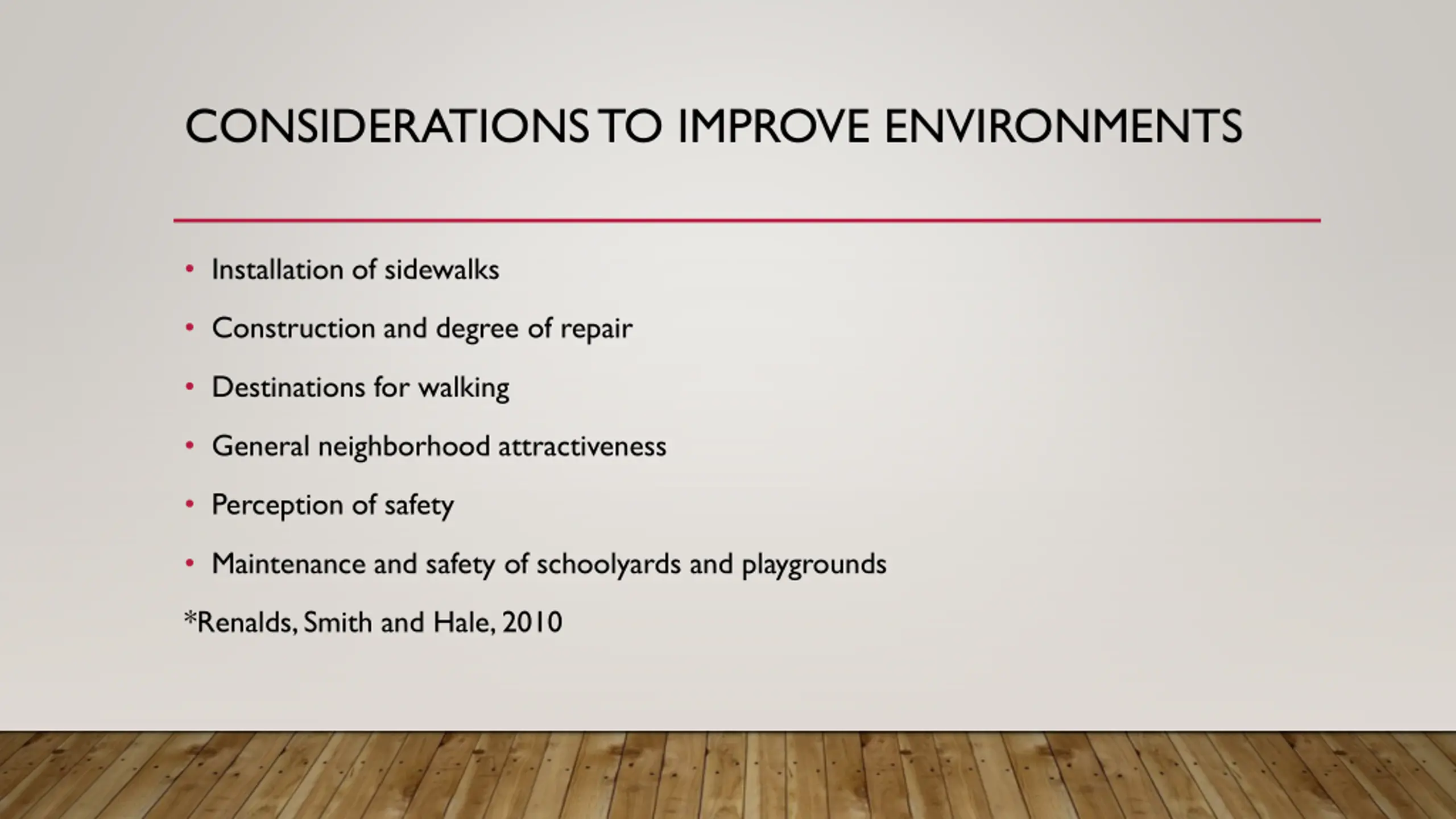 CONSIDERATIONS TO IMPROVE ENVIRONMENTS Installation of sidewalks Construction and degree of repair Destinations for walking General neighborhood attractiveness Perception of safety Maintenance and safety of schoolyards and playgrounds *Renalds, Smith and Hale, 2010