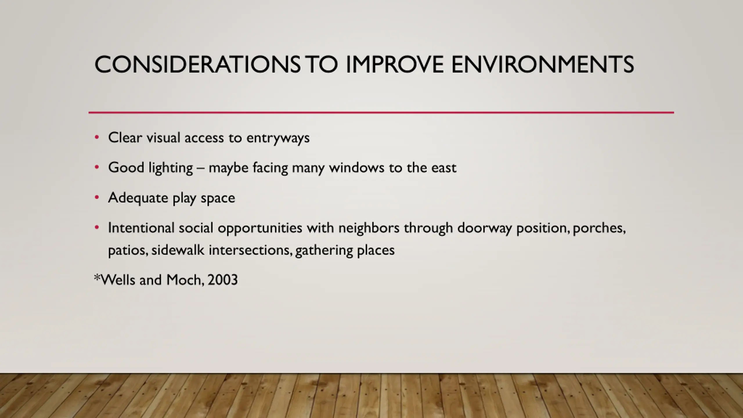 CONSIDERATIONS TO IMPROVE ENVIRONMENTS Clear visual access to entryways Good lighting maybe facing many windows to the east Adequate play space Intentional social opportunities with neighbors through doorway position, porches, patios, sidewalk intersections, gathering places *Wells and Moch, 2003