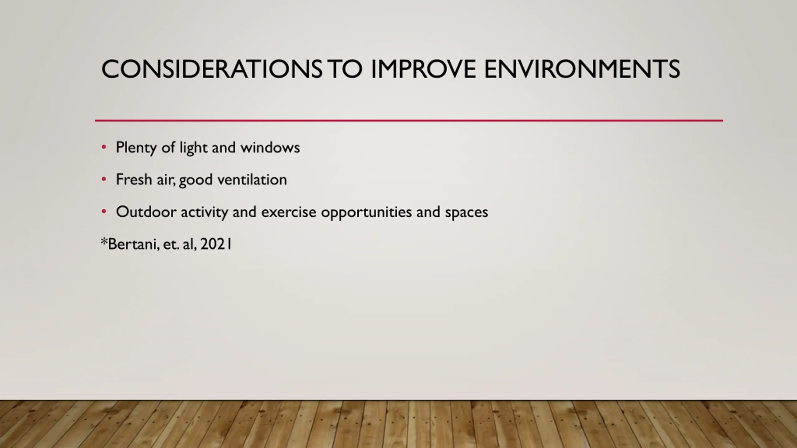CONSIDERATIONS TO IMPROVE ENVIRONMENTS Plenty of light and windows Fresh air, good ventilation Outdoor activity and exercise opportunities and spaces *Bertani, et. al, 2021