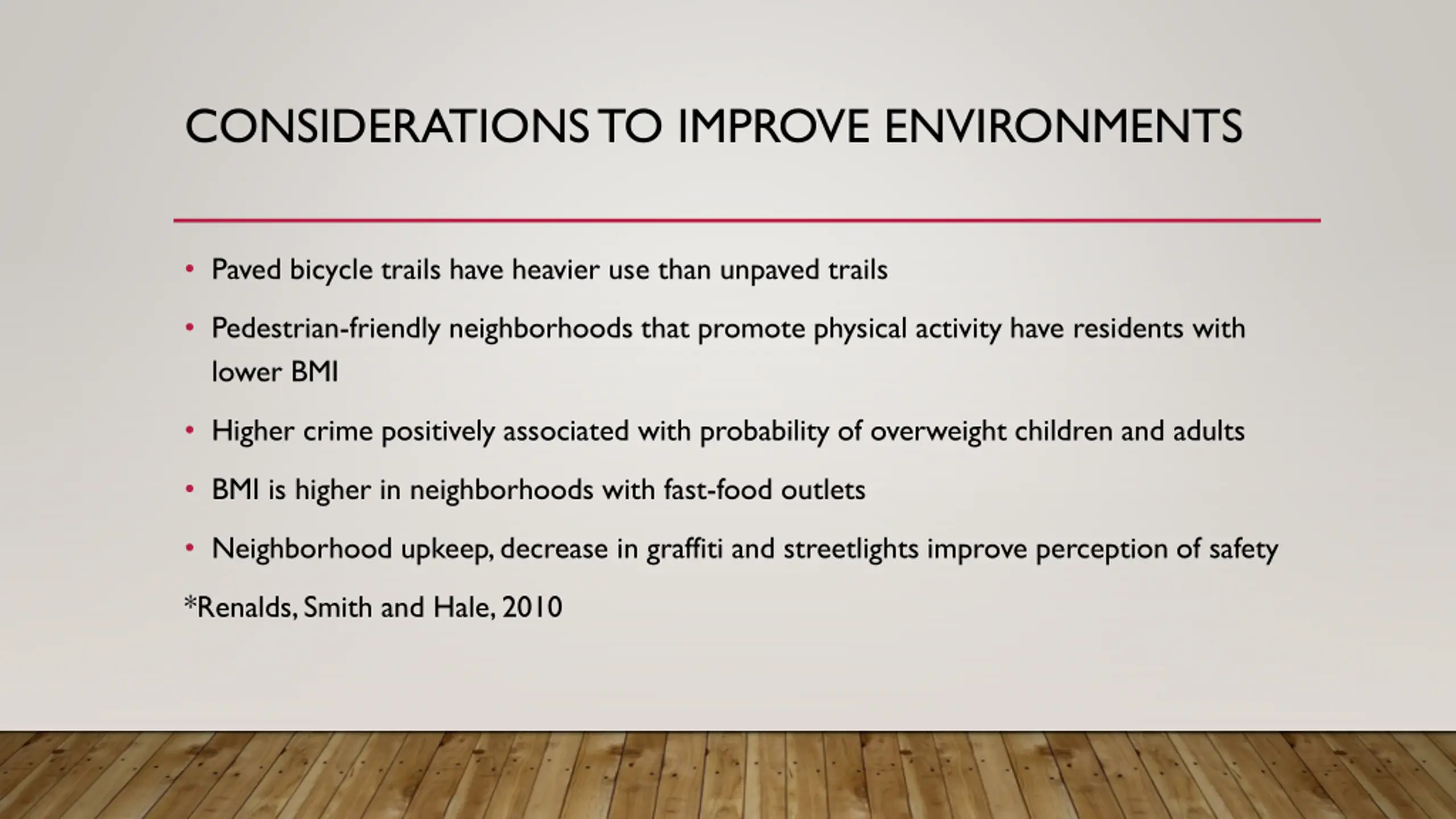 CONSIDERATIONS TO IMPROVE ENVIRONMENTS Paved bicycle trails have heavier use than unpaved trails Pedestrian-friendly neighborhoods that promote physical activity have residents with lower BMI Higher crime positively associated with probability of overweight children and adults BMI is higher in neighborhoods with fast-food outlets Neighborhood upkeep, decrease in graffiti and streetlights improve perception of safety *Renalds, Smith and Hale, 2010