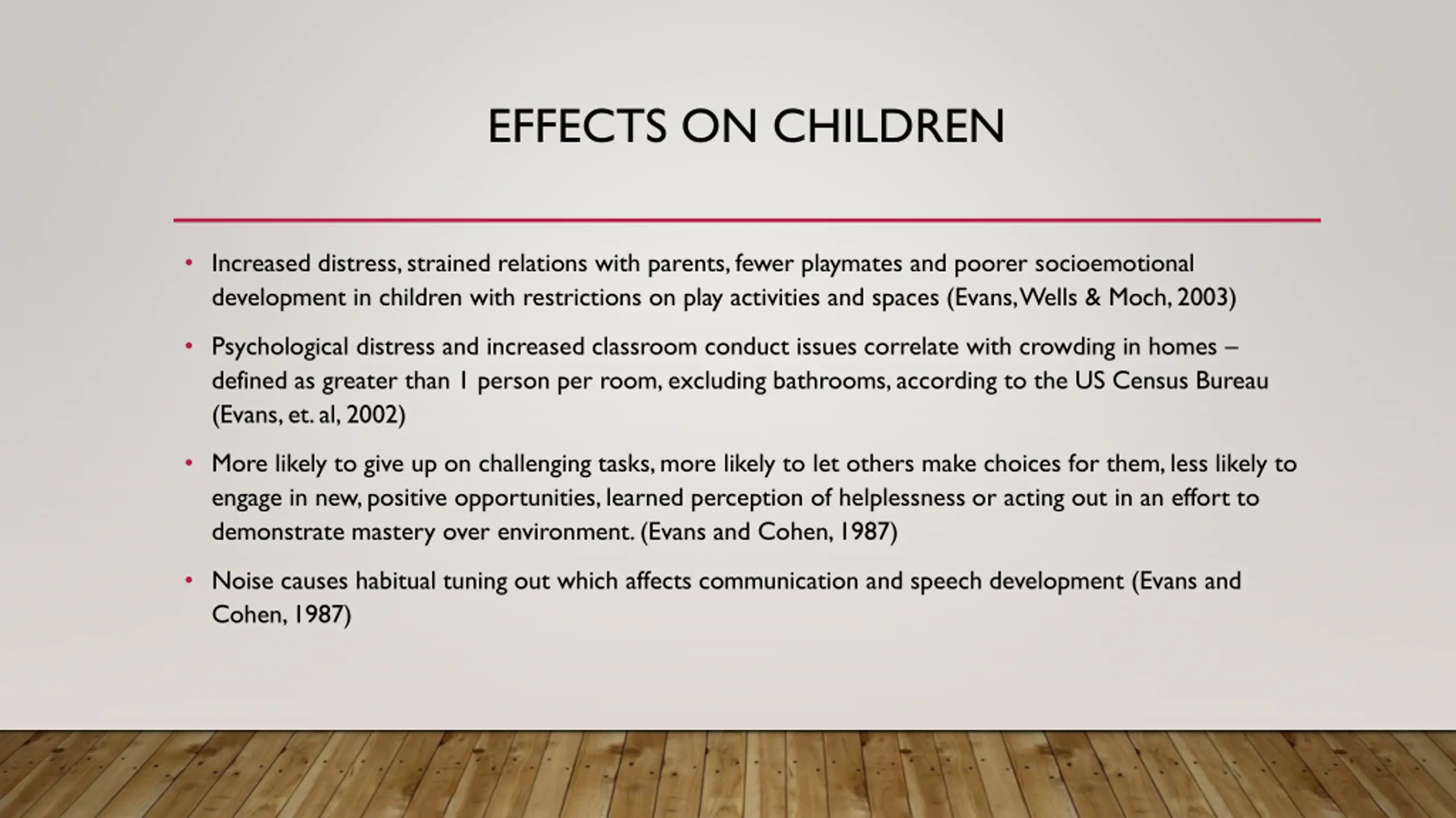 EFFECTS ON CHILDREN Increased distress, strained relations with parents, fewer playmates and poorer socioemotional development in children with restrictions on play activities and spaces (Evans, Wells & Moch, 2003) Psychological distress and increased classroom conduct issues correlate with crowding in homes defined as greater than 1 person per room, excluding bathrooms, according to the US Census Bureau (Evans, et. al, 2002) More likely to give up on challenging tasks, more likely to let others make choices for them, less likely to engage in new, positive opportunities, learned perception of helplessness or acting out in an effort to demonstrate mastery over environment. (Evans and Cohen, 1987) Noise causes habitual tuning out which affects communication and speech development (Evans and Cohen, 1987)