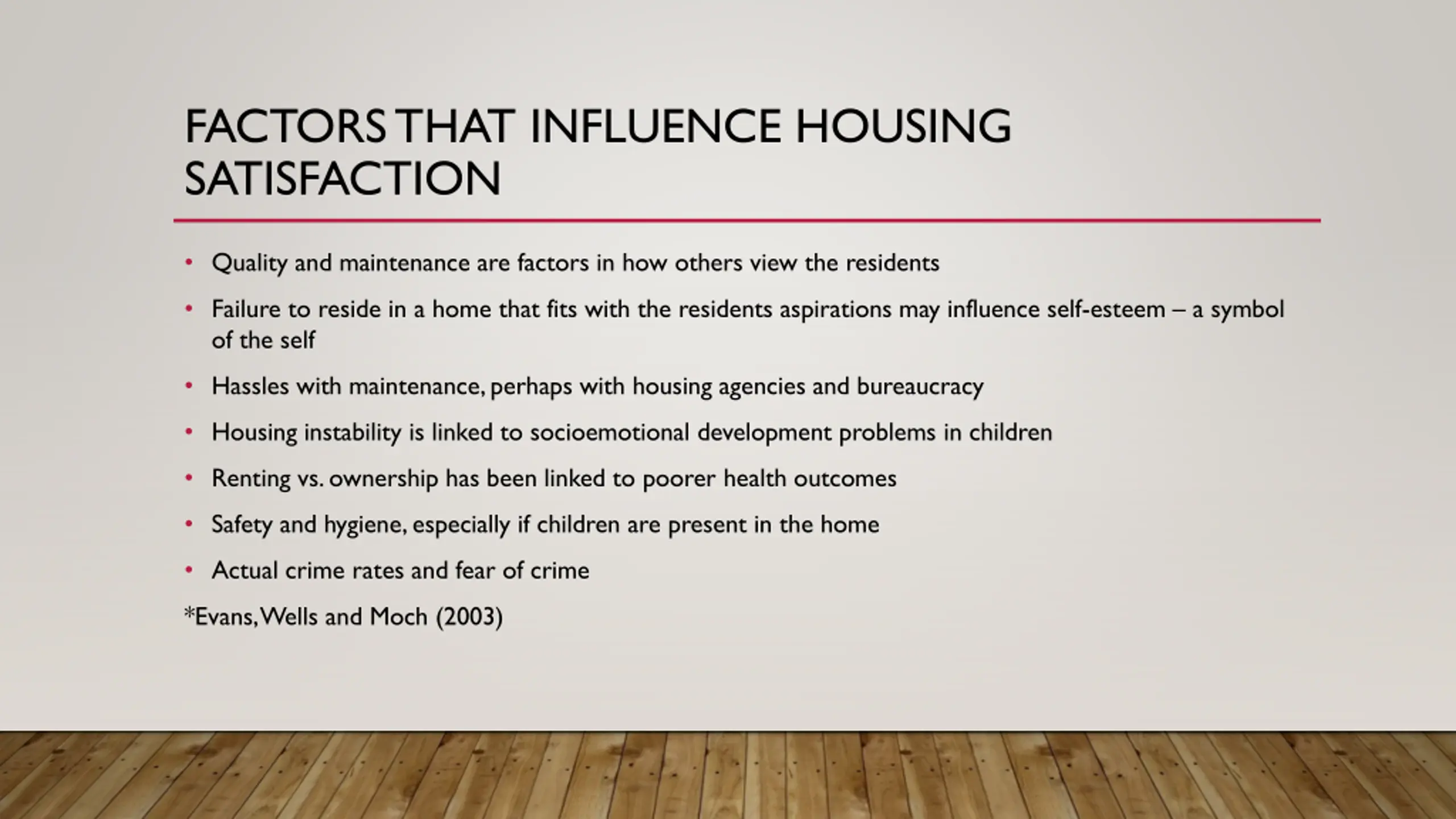 FACTORS THAT INFLUENCE HOUSING SATISFACTION Quality and maintenance are factors in how others view the residents Failure to reside in a home that fits with the residents aspirations may influence self-esteem a symbol of the self Hassles with maintenance, perhaps with housing agencies and bureaucracy Housing instability is linked to socioemotional development problems in children Renting vs. ownership has been linked to poorer health outcomes Safety and hygiene, especially if children are present in the home Actual crime rates and fear of crime *Evans, Wells and Moch (2003)