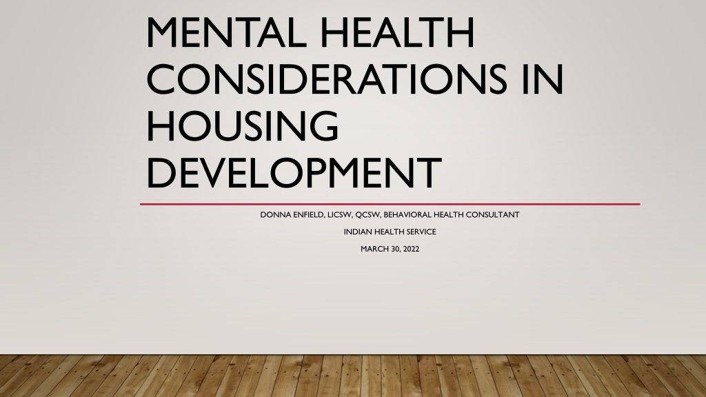 MENTAL HEALTH CONSIDERATIONS IN HOUSING DEVELOPMENT DONNA ENFIELD, LICSW, QCSW, BEHAVIORAL HEALTH CONSULTANT INDIAN HEALTH SERVICE MARCH 30, 2022