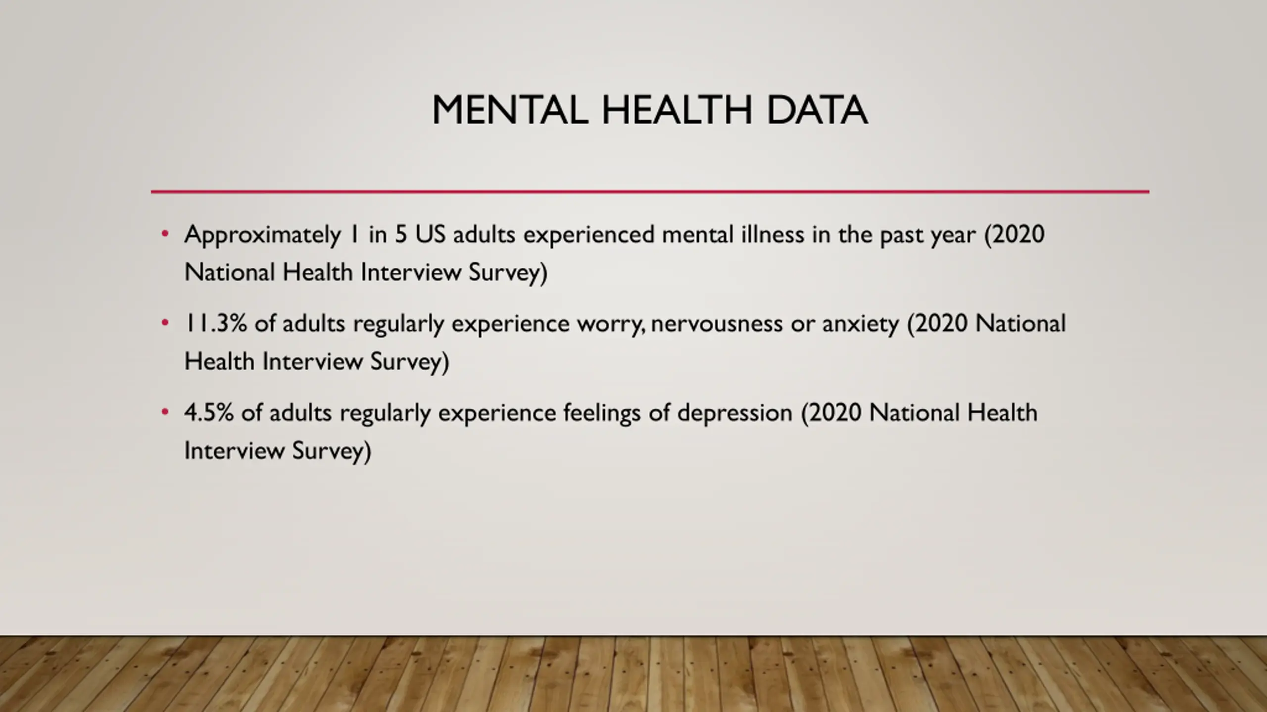 MENTAL HEALTH DATA Approximately 1 in 5 US adults experienced mental illness in the past year (2020 National Health Interview Survey) 11.3% of adults regularly experience worry, nervousness or anxiety (2020 National Health Interview Survey) 4.5% of adults regularly experience feelings of depression (2020 National Health Interview Survey)