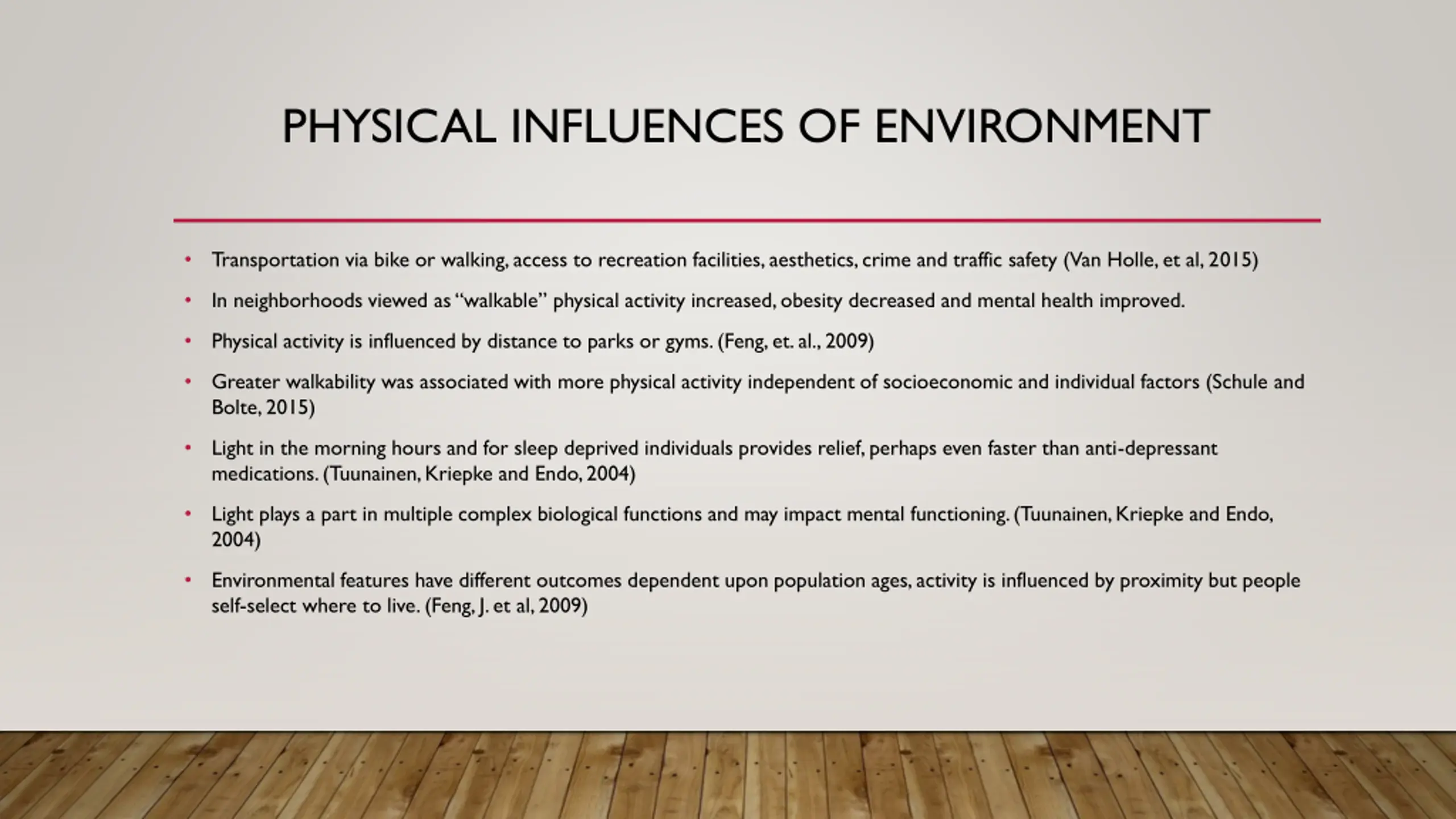PHYSICAL INFLUENCES OF ENVIRONMENT Transportation via bike or walking, access to recreation facilities, aesthetics, crime and traffic safety (Van Holle, et al, 2015) In neighborhoods viewed as walkable physical activity increased, obesity decreased and mental health improved. Physical activity is influenced by distance to parks or gyms. (Feng, et. al., 2009) Greater walkability was associated with more physical activity independent of socioeconomic and individual factors (Schule and Bolte, 2015) Light in the morning hours and for sleep deprived individuals provides relief, perhaps even faster than anti-depressant medications. (Tuunainen, Kriepke and Endo, 2004) Light plays a part in multiple complex biological functions and may impact mental functioning. (Tuunainen, Kriepke and Endo, 2004) Environmental features have different outcomes dependent upon population ages, activity is influenced by proximity but people self-select where to live. (Feng, J. et al, 2009)