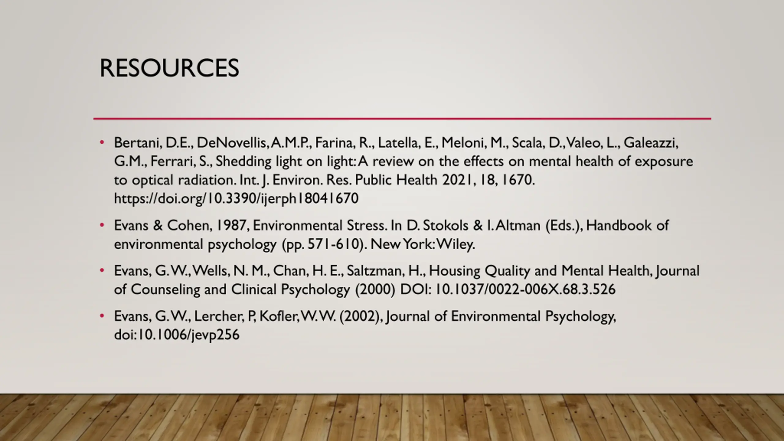 RESOURCES Bertani, D.E., DeNovellis, A.M.P., Farina, R., Latella, E., Meloni, M., Scala, D., Valeo, L., Galeazzi, G.M., Ferrari, S., Shedding light on light: A review on the effects on mental health of exposure to optical radiation. Int. J. Environ. Res. Public Health 2021, 18, 1670. https://doi.org/10.3390/ijerph18041670 Evans & Cohen, 1987, Environmental Stress. In D. Stokols & I. Altman (Eds.), Handbook of environmental psychology (pp. 571-610). New York: Wiley. Evans, G. W., Wells, N. M., Chan, H. E., Saltzman, H., Housing Quality and Mental Health, Journal of Counseling and Clinical Psychology (2000) DOI: 10.1037/0022-006X.68.3.526 Evans, G. W., Lercher, P, Kofler, W. W. (2002), Journal of Environmental Psychology, doi:10.1006/jevp256