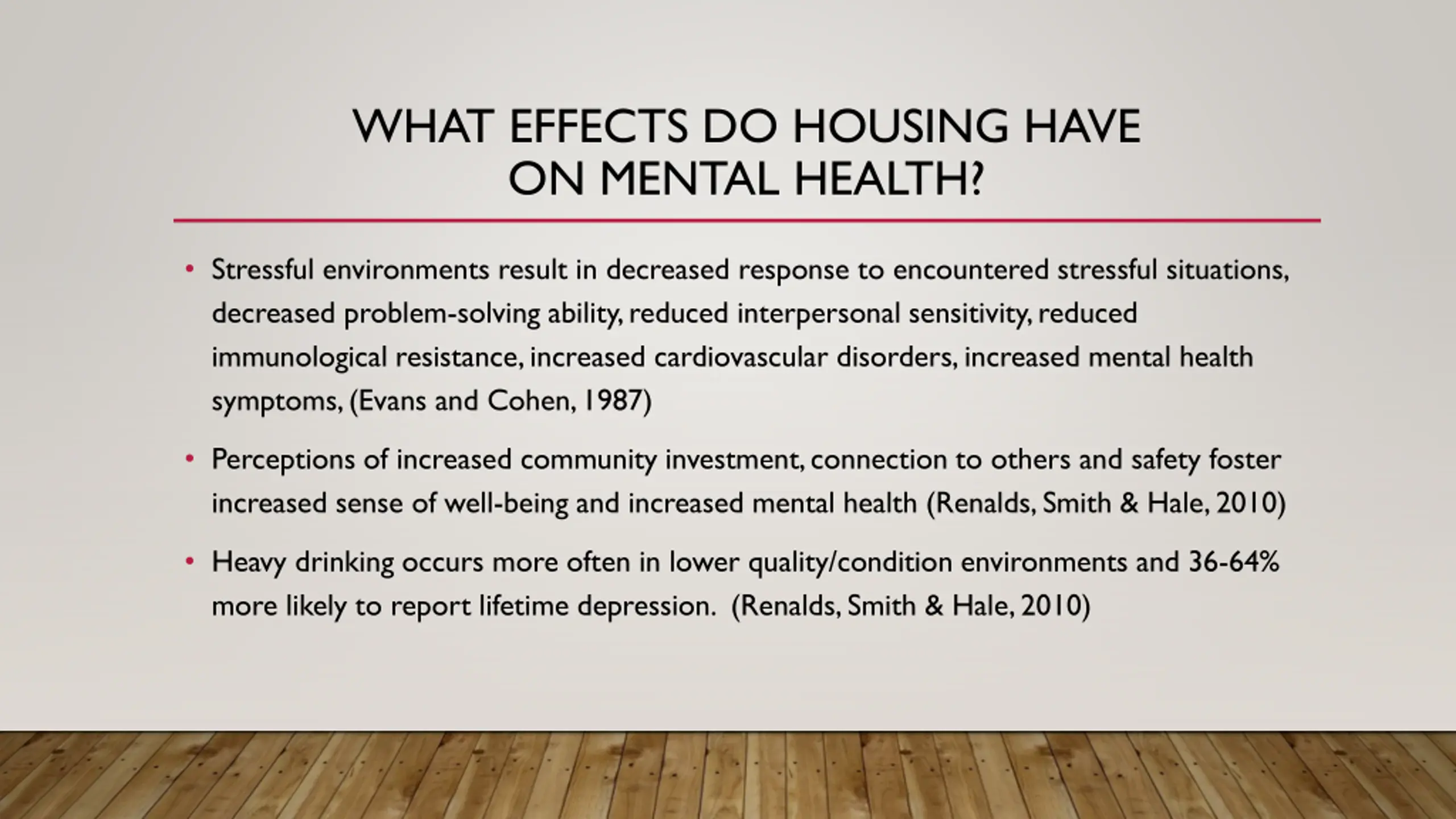 WHAT EFFECTS DO HOUSING HAVE ON MENTAL HEALTH? Stressful environments result in decreased response to encountered stressful situations, decreased problem-solving ability, reduced interpersonal sensitivity, reduced immunological resistance, increased cardiovascular disorders, increased mental health symptoms, (Evans and Cohen, 1987) Perceptions of increased community investment, connection to others and safety foster increased sense of well-being and increased mental health (Renalds, Smith & Hale, 2010) Heavy drinking occurs more often in lower quality/condition environments and 36-64% more likely to report lifetime depression. (Renalds, Smith & Hale, 2010)