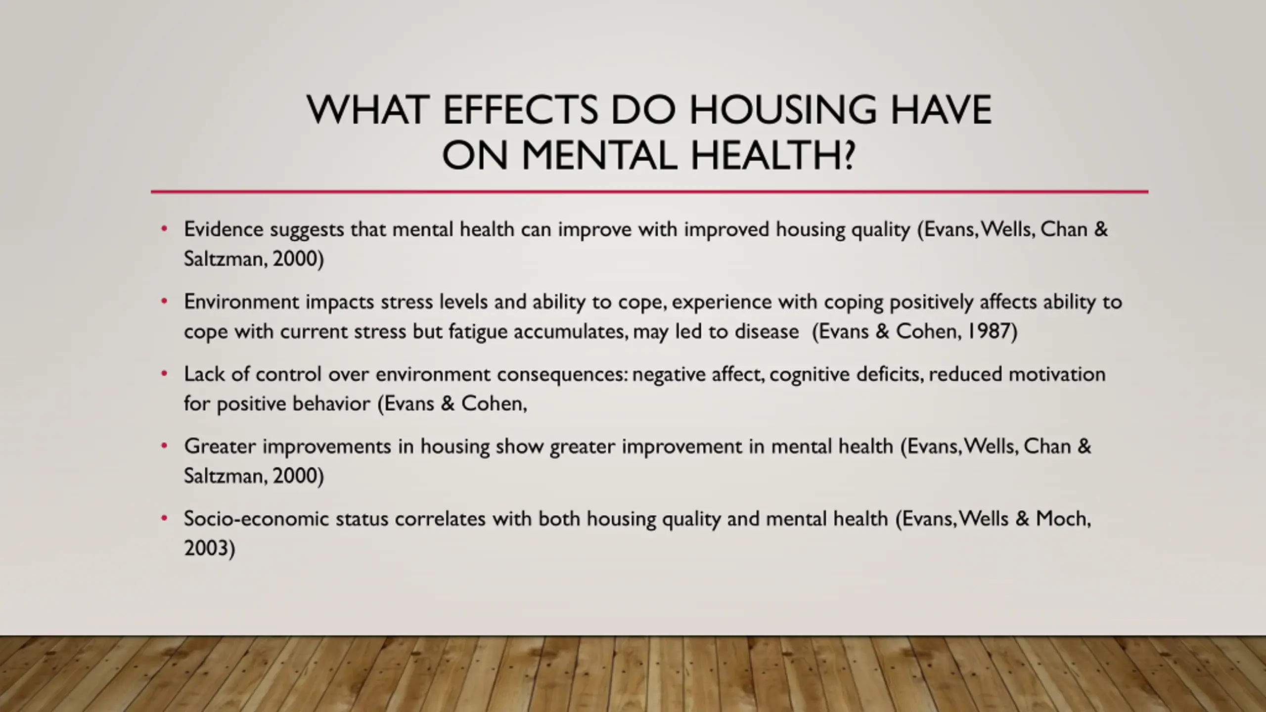 WHAT EFFECTS DO HOUSING HAVE ON MENTAL HEALTH? Evidence suggests that mental health can improve with improved housing quality (Evans, Wells, Chan & Saltzman, 2000) Environment impacts stress levels and ability to cope, experience with coping positively affects ability to cope with current stress but fatigue accumulates, may led to disease (Evans & Cohen, 1987) Lack of control over environment consequences: negative affect, cognitive deficits, reduced motivation for positive behavior (Evans & Cohen, Greater improvements in housing show greater improvement in mental health (Evans, Wells, Chan & Saltzman, 2000) Socio-economic status correlates with both housing quality and mental health (Evans, Wells & Moch, 2003)