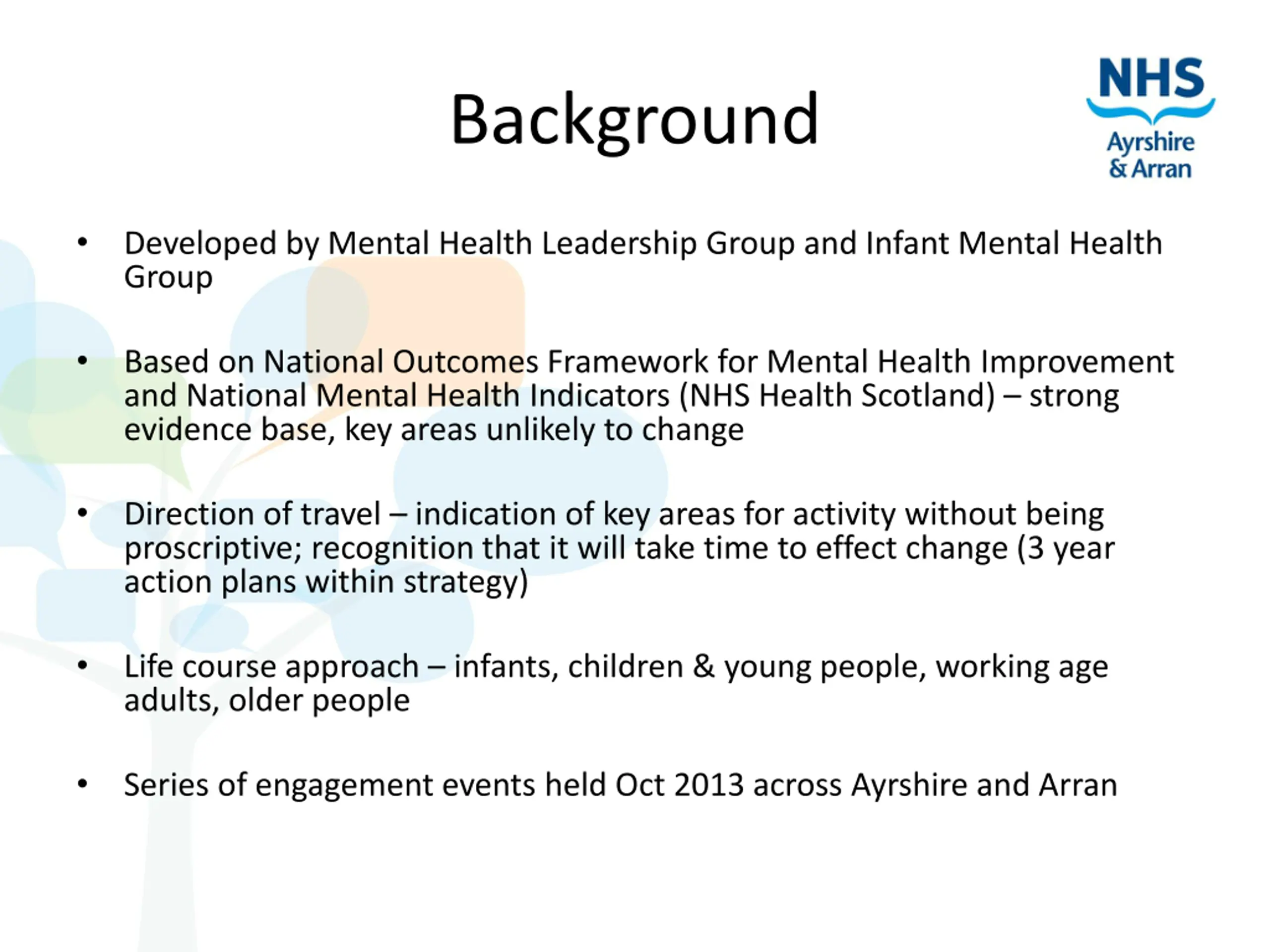 Background Developed by Mental Health Leadership Group and Infant Mental Health Group Based on National Outcomes Framework for Mental Health Improvement and National Mental Health Indicators (NHS Health Scotland) strong evidence base, key areas unlikely to change Direction of travel indication of key areas for activity without being proscriptive; recognition that it will take time to effect change (3 year action plans within strategy) Life course approach infants, children & young people, working age adults, older people Series of engagement events held Oct 2013 across Ayrshire and Arran