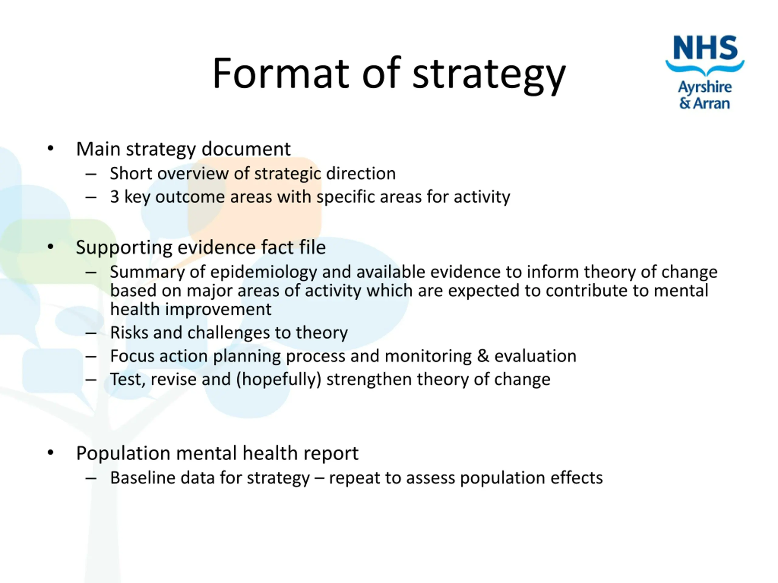 Format of strategy Main strategy document Short overview of strategic direction 3 key outcome areas with specific areas for activity Supporting evidence fact file Summary of epidemiology and available evidence to inform theory of change based on major areas of activity which are expected to contribute to mental health improvement Risks and challenges to theory Focus action planning process and monitoring & evaluation Test, revise and (hopefully) strengthen theory of change Population mental health report Baseline data for strategy repeat to assess population effects