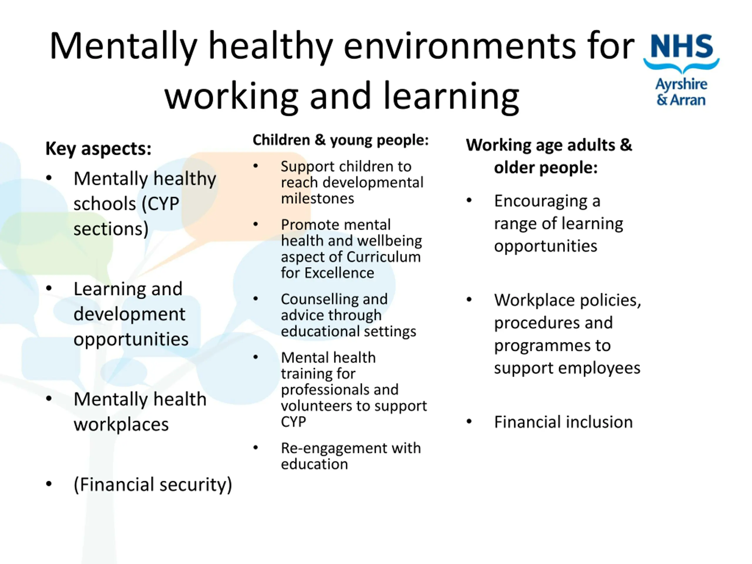 Mentally healthy environments for working and learning Children & young people: Support children to reach developmental milestones Promote mental health and wellbeing aspect of Curriculum for Excellence Counselling and advice through educational settings Mental health training for professionals and volunteers to support CYP Re-engagement with education Working age adults & older people: Key aspects: Mentally healthy schools (CYP sections) Encouraging a range of learning opportunities Learning and development opportunities Workplace policies, procedures and programmes to support employees Mentally health workplaces Financial inclusion (Financial security)